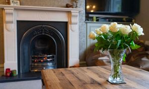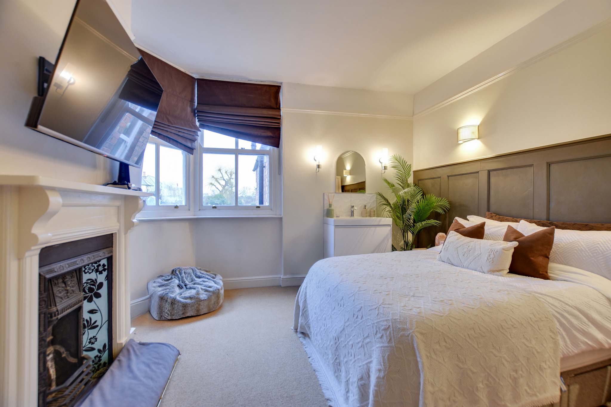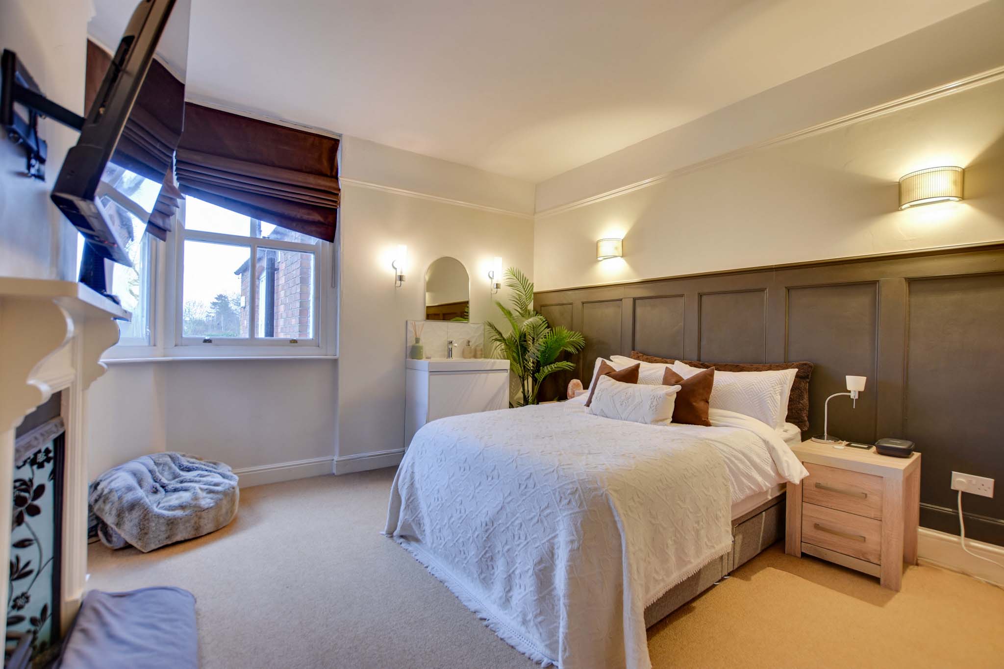 With two double-glazed sash windows to the rear elevation, a feature period style fireplace with hearth and fire surround, picture rail, part wood panelled walls, a wash hand basin, a TV and a radiator.