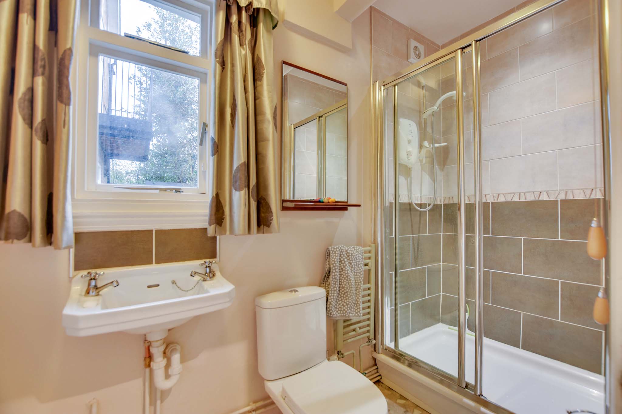 With a glazed window to the side elevation, a walk-in shower with electric shower, extractor fan, wash hand basin, low-level WC and a heated towel radiator.