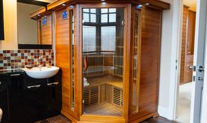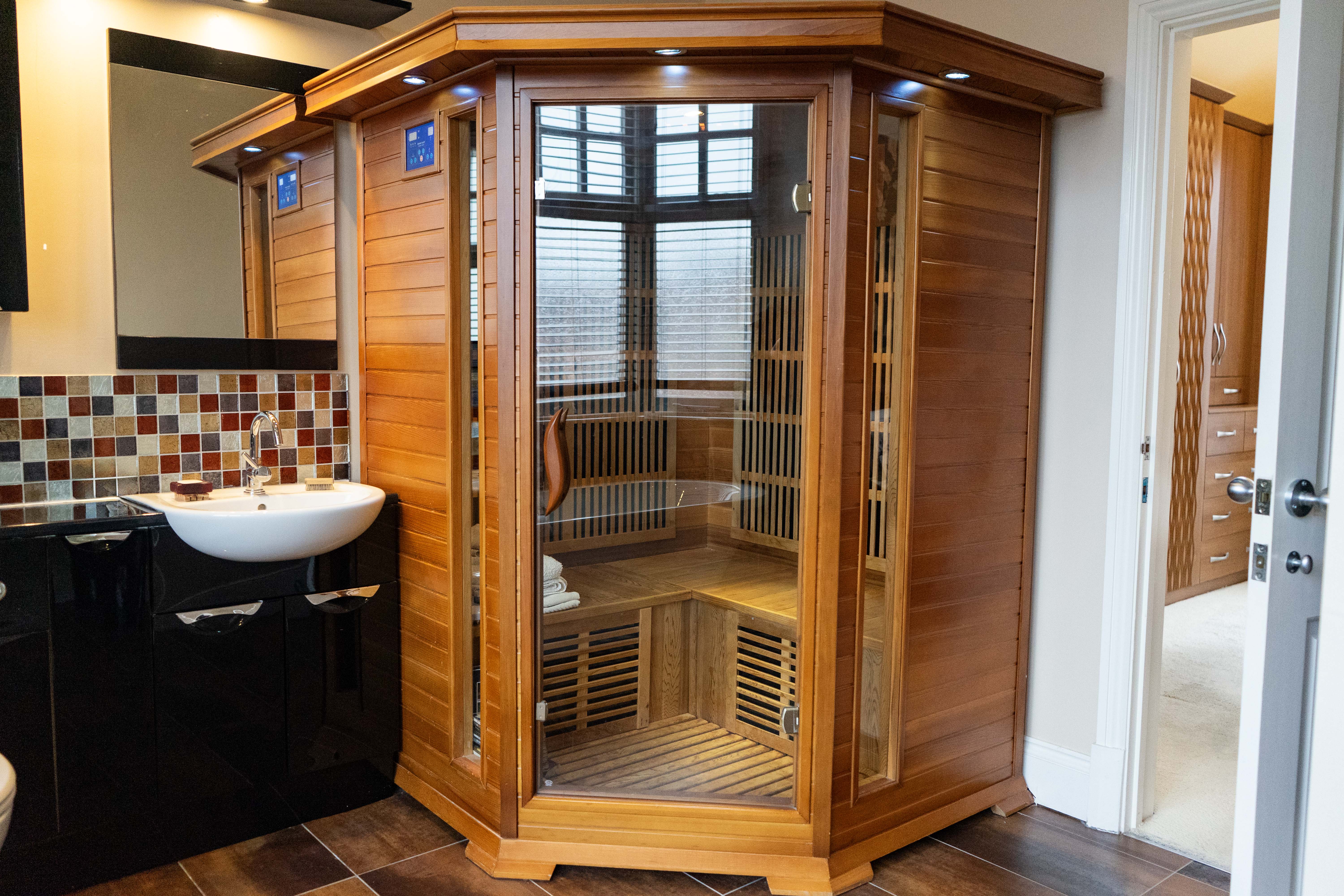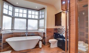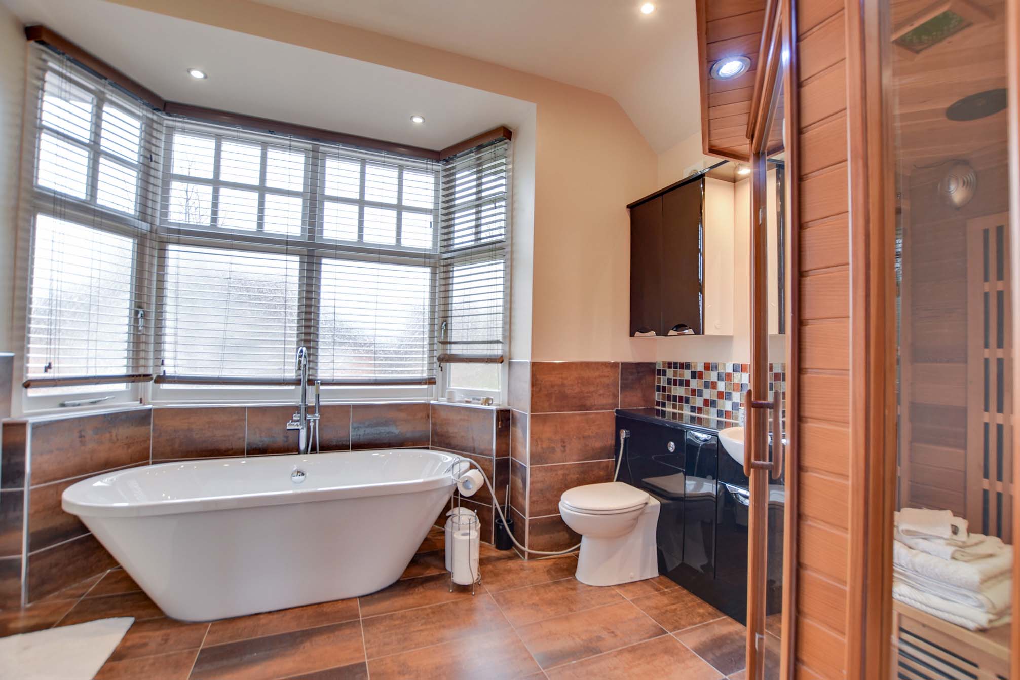 With a double-glazed bay window to the front elevation, freestanding bath with mixer tap shower attachment, a separate tiled shower cubicle with overhead rainfall shower and hand-held shower attachment, infrared sauna, low-level WC, wash hand basin, tiled flooring, partly tiled walls, ceiling spotlights and radiator.