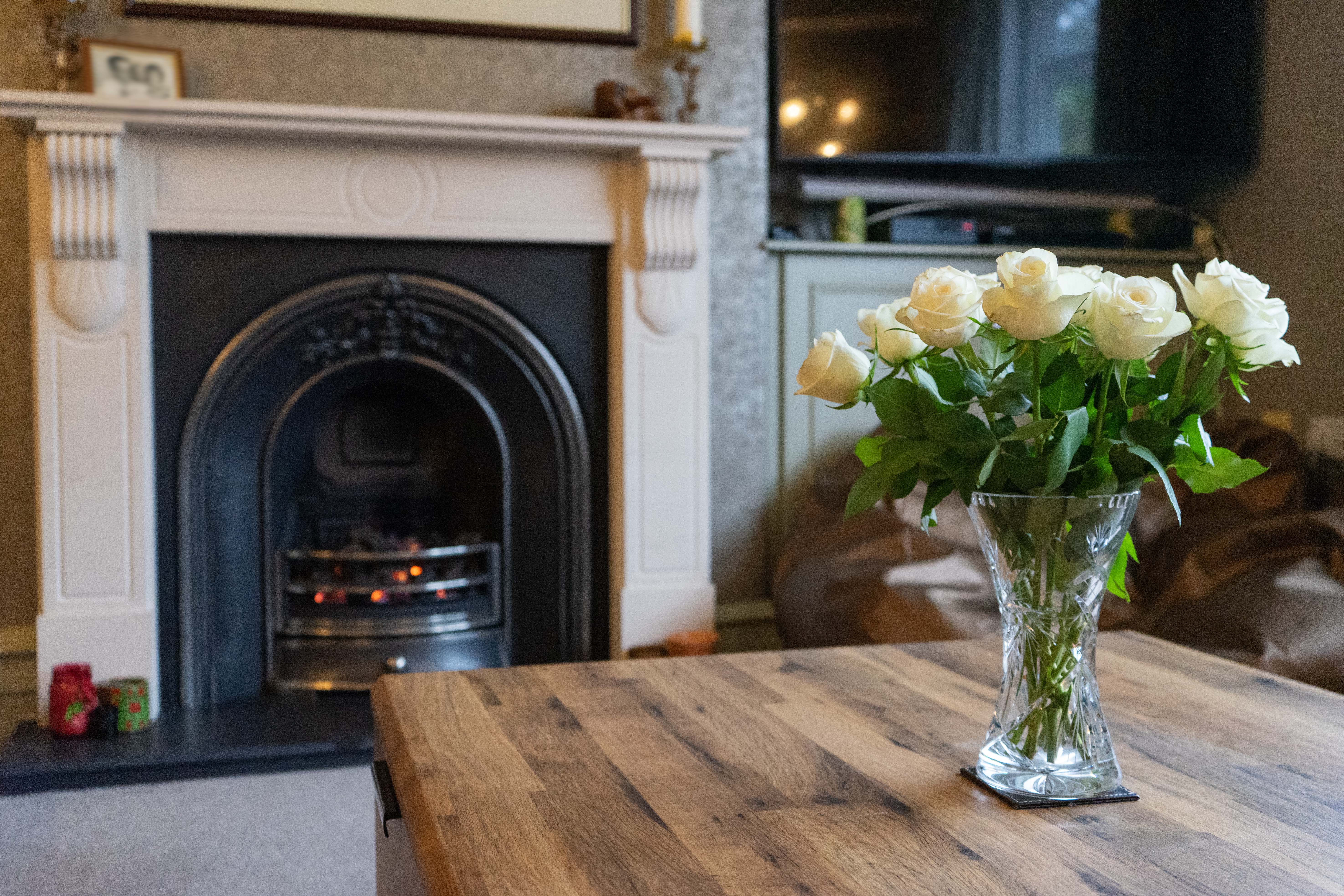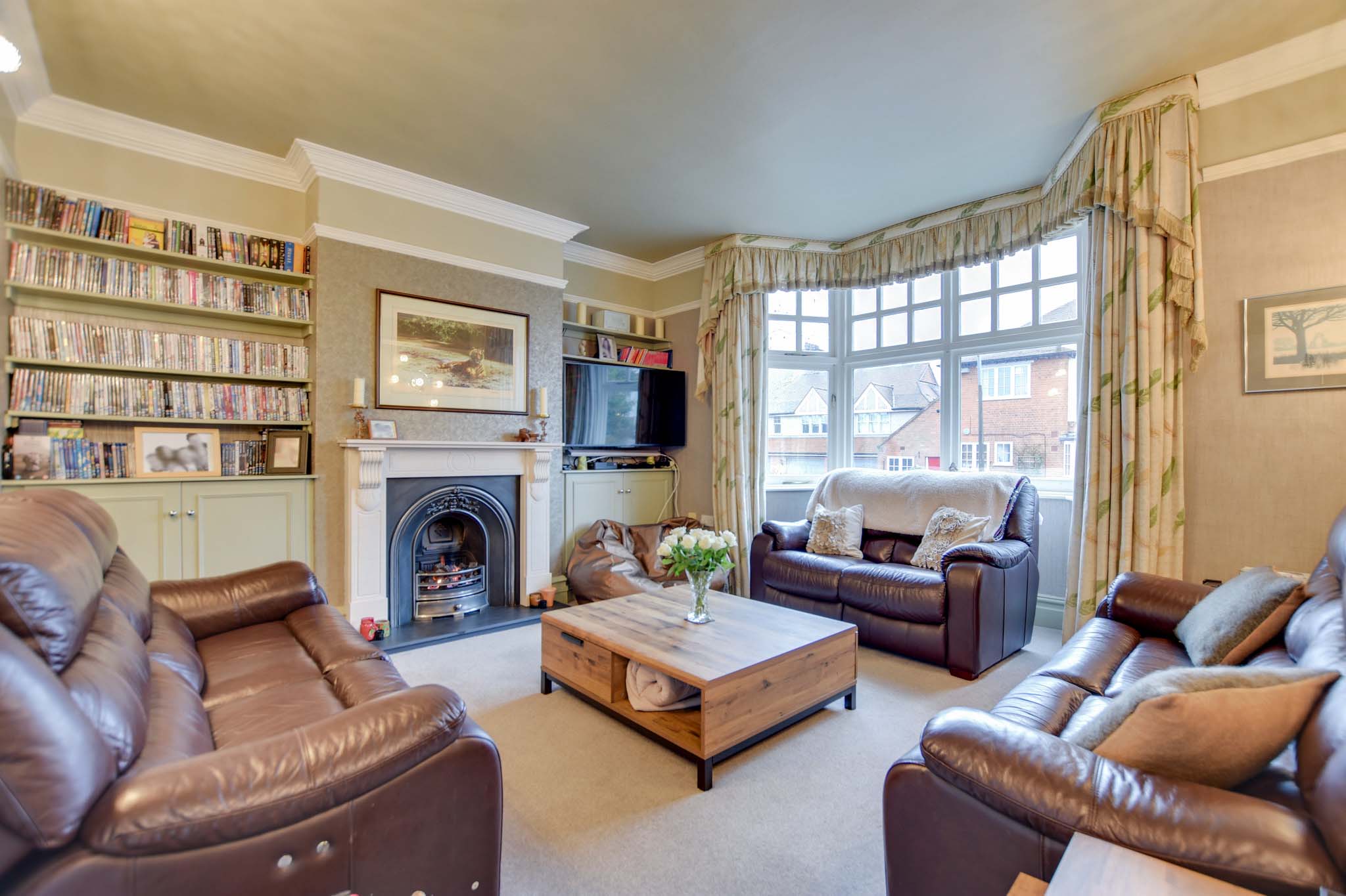 With a double-glazed bay window to the front elevation, coving to the ceiling, picture rail, built-in bookshelf, storage cupboards, a living flame-effect gas fire with hearth and surround, a TV point, and two radiators.