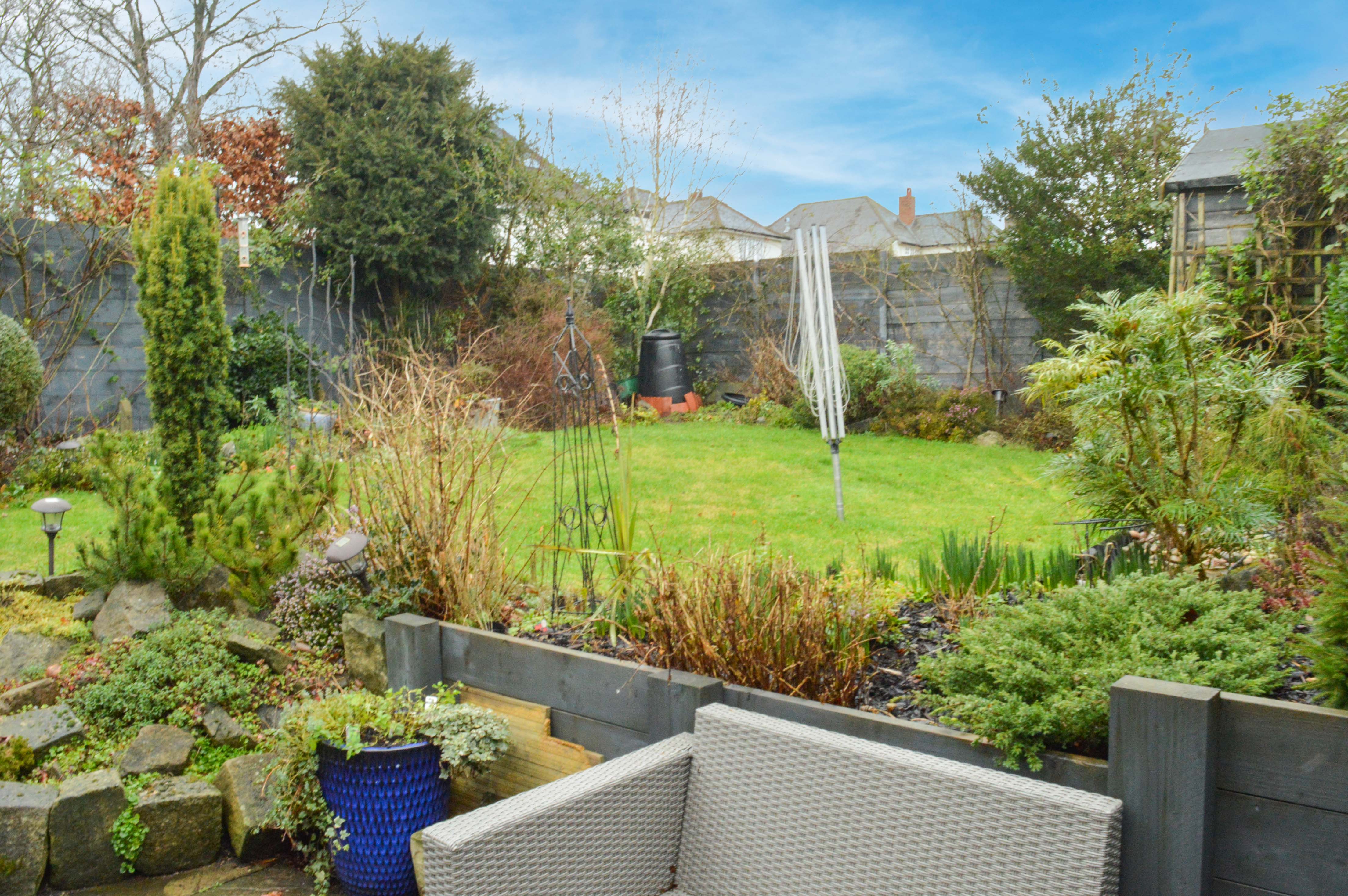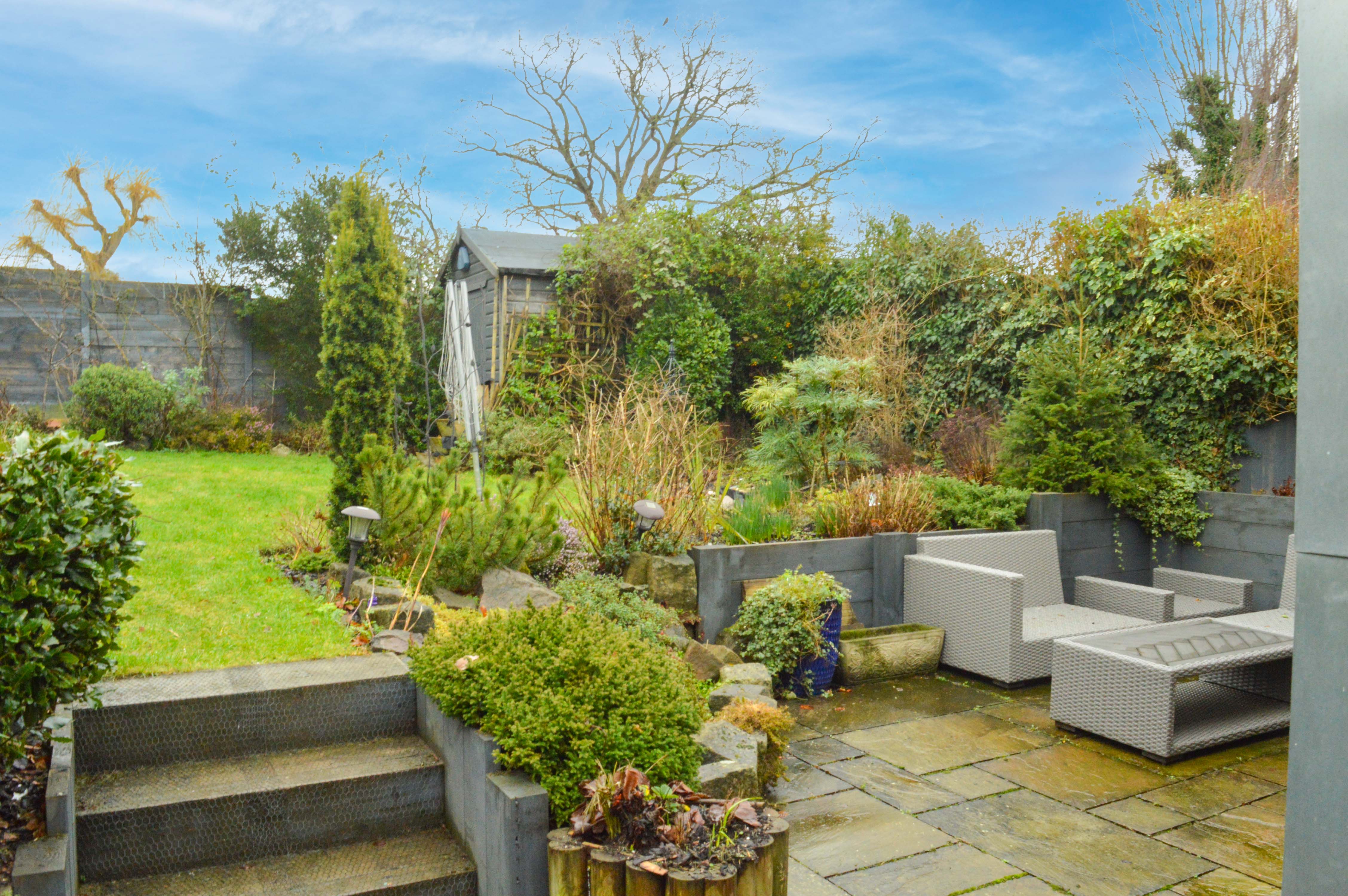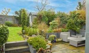 With a paved patio framed by raised, mature flower beds, established shrubs, rose bushes and trees, this lovely outdoor space is perfect for relaxing or entertaining. To the rear, a further paved seating area with steps that lead up to a mainly lawned garden with well-stocked border beds, a garden shed, and fencing to the sides and rear. Additional features include outside lighting, an outside tap, an external power supply and access to the garage.