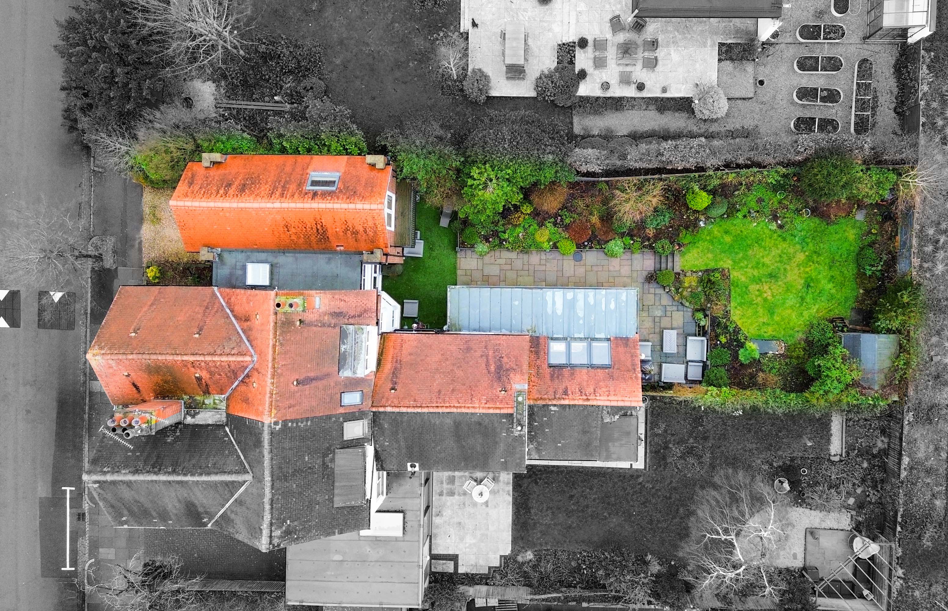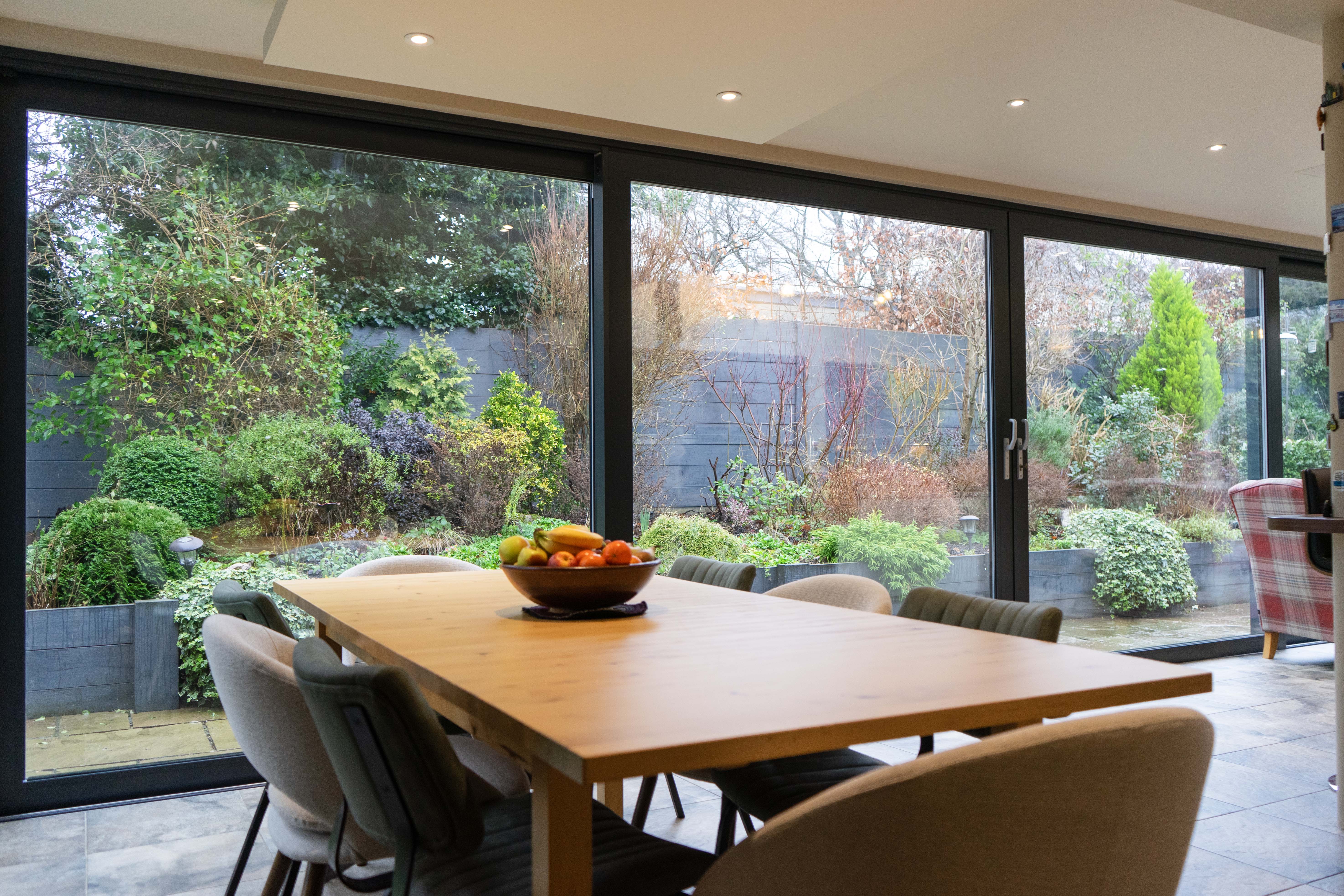 A particular highlight of the home is the spacious open-plan living kitchen dining room, which benefits from triple glazing. This impressive space is filled with natural light from large sliding doors, picture windows and three skylights. The kitchen is fitted with a comprehensive range of units and integrated Siemens appliances, complemented by marble work surfaces, a central island with breakfast bar, underfloor heating and defined seating and dining areas, making it well suited to both everyday living and entertaining.