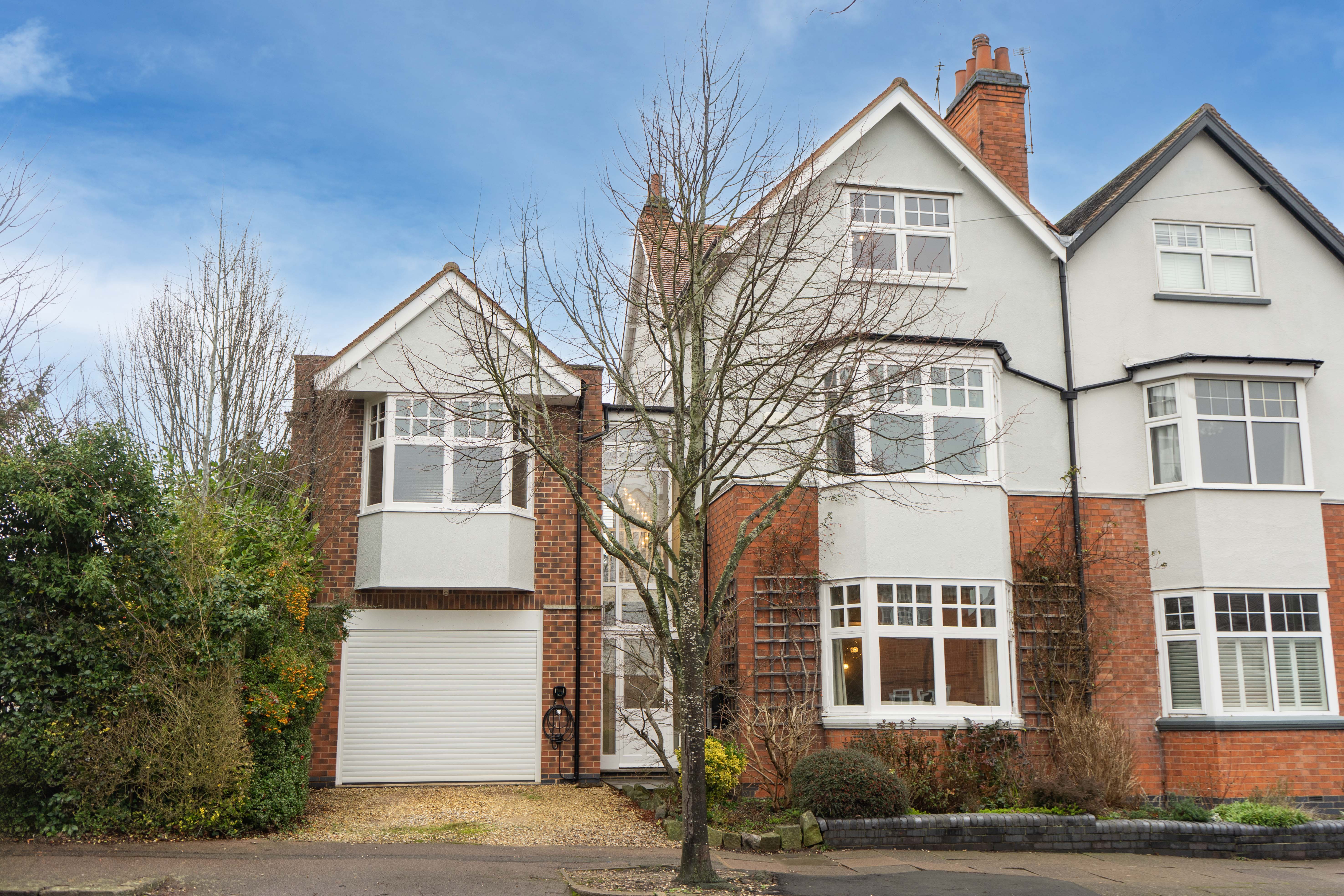 To the front, a gravelled driveway provides off-road parking and leads to the garage, which benefits from an electric roller shutter door, power, lighting and access to the rear garden. An EV charging point is also conveniently located at the front of the property.