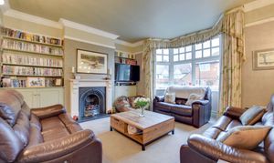 The property is entered via an impressive L-shaped entrance hall, featuring a tall double glazed window to the front elevation, stairs rising to the first floor and internal access to the garage. To the front, the first reception room enjoys a bay window and includes a range of character features such as coving, picture rails, built-in shelving and a living flame-effect gas fire.
