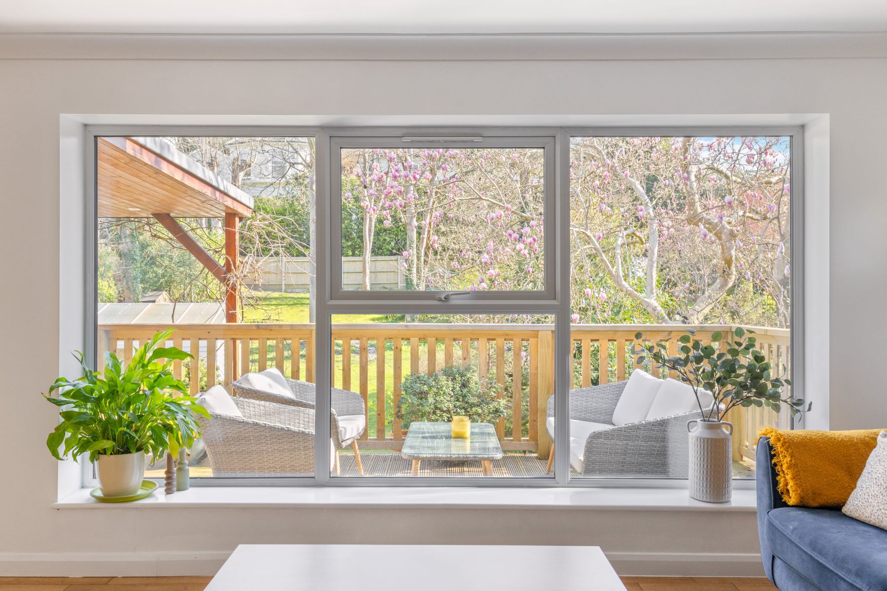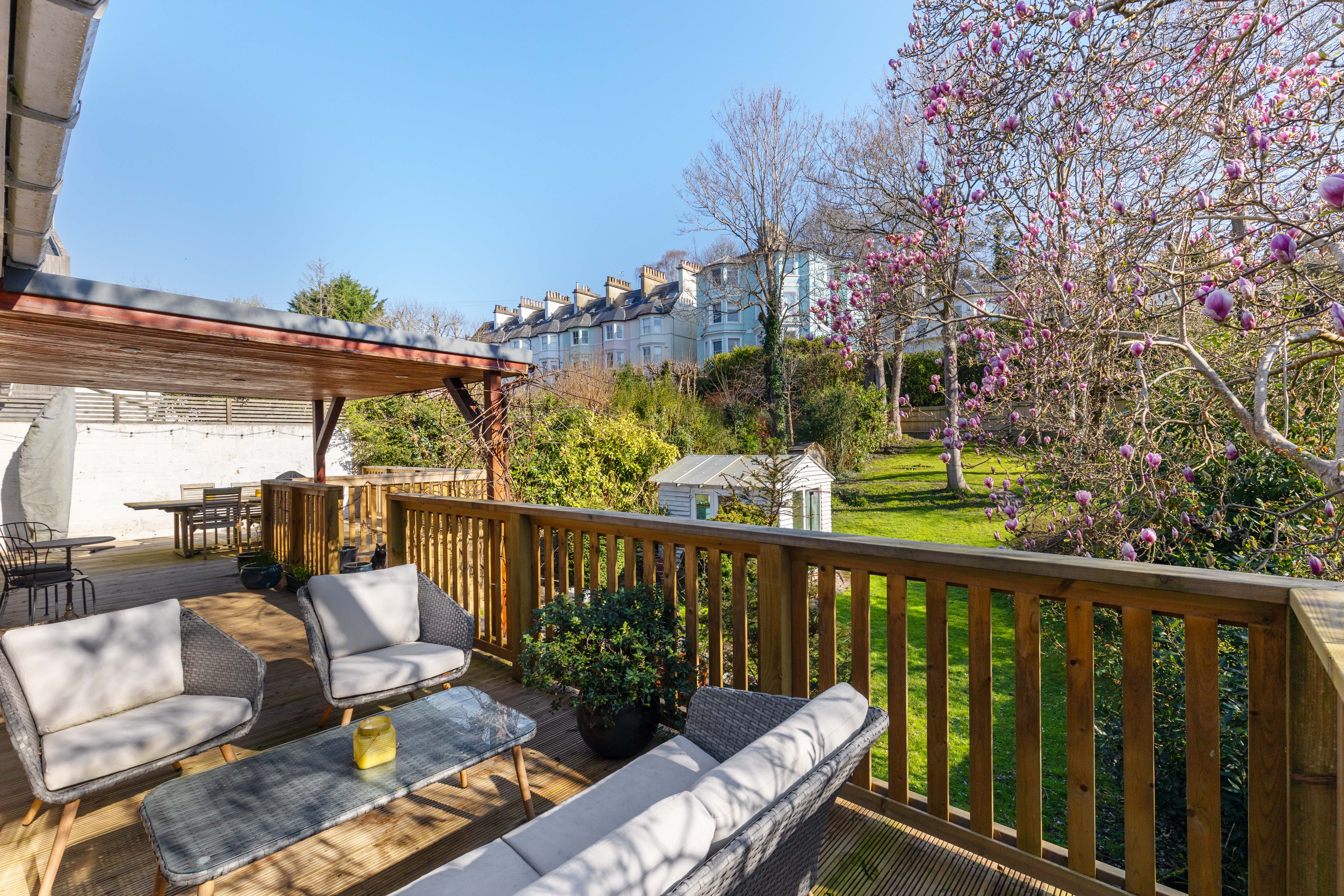 Externally, the property truly excels. A raised decking area spans the width of the house, providing the perfect setting for outdoor dining and relaxation, with steps leading down to an expansive lawn. The garden enjoys mature trees and established planting, offering colour and year-round interest.