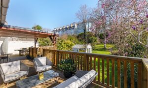 Exceptionally spacious rear garden, with raised decking, expansive lawn, mature trees and established planting