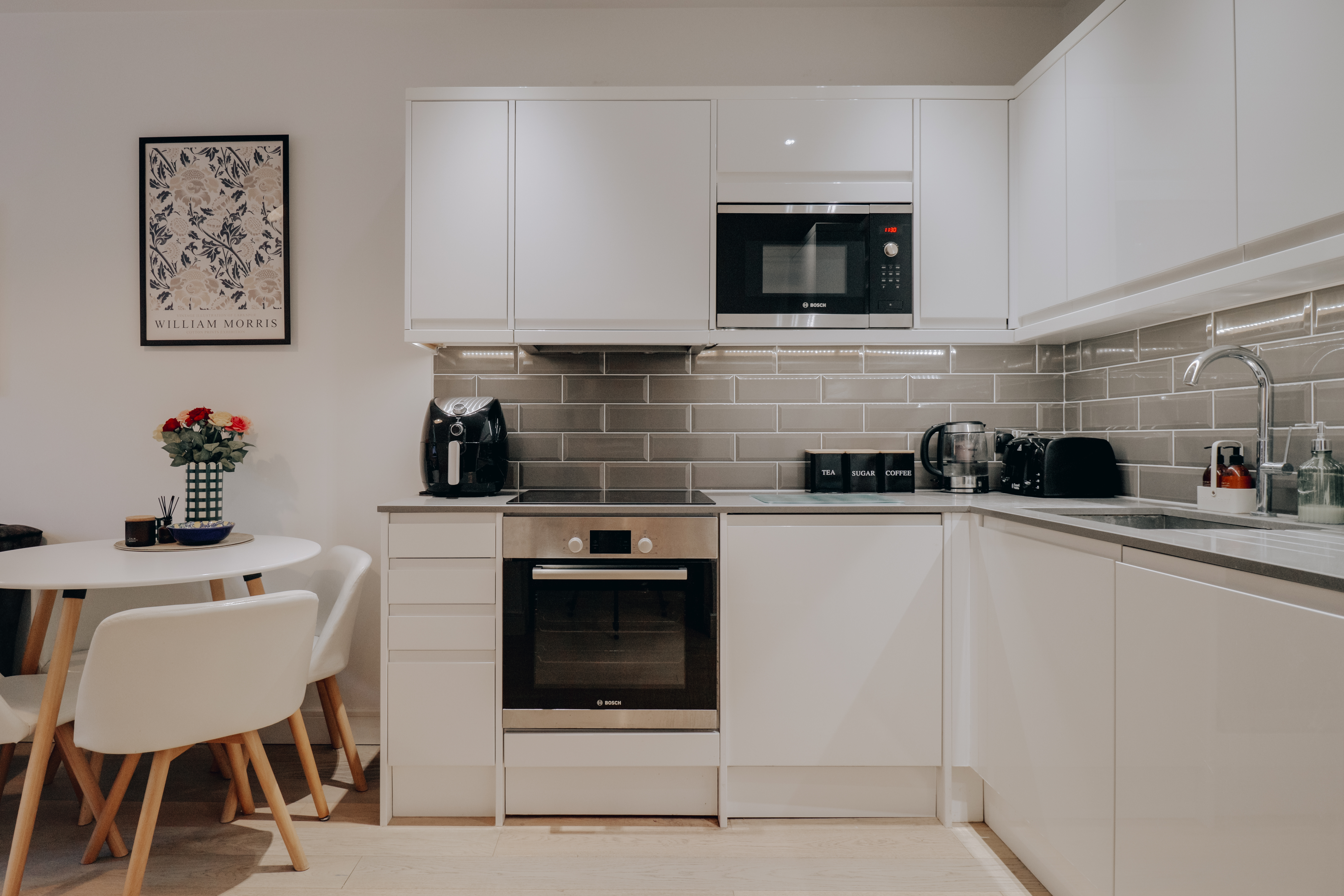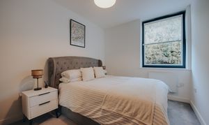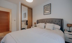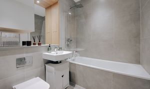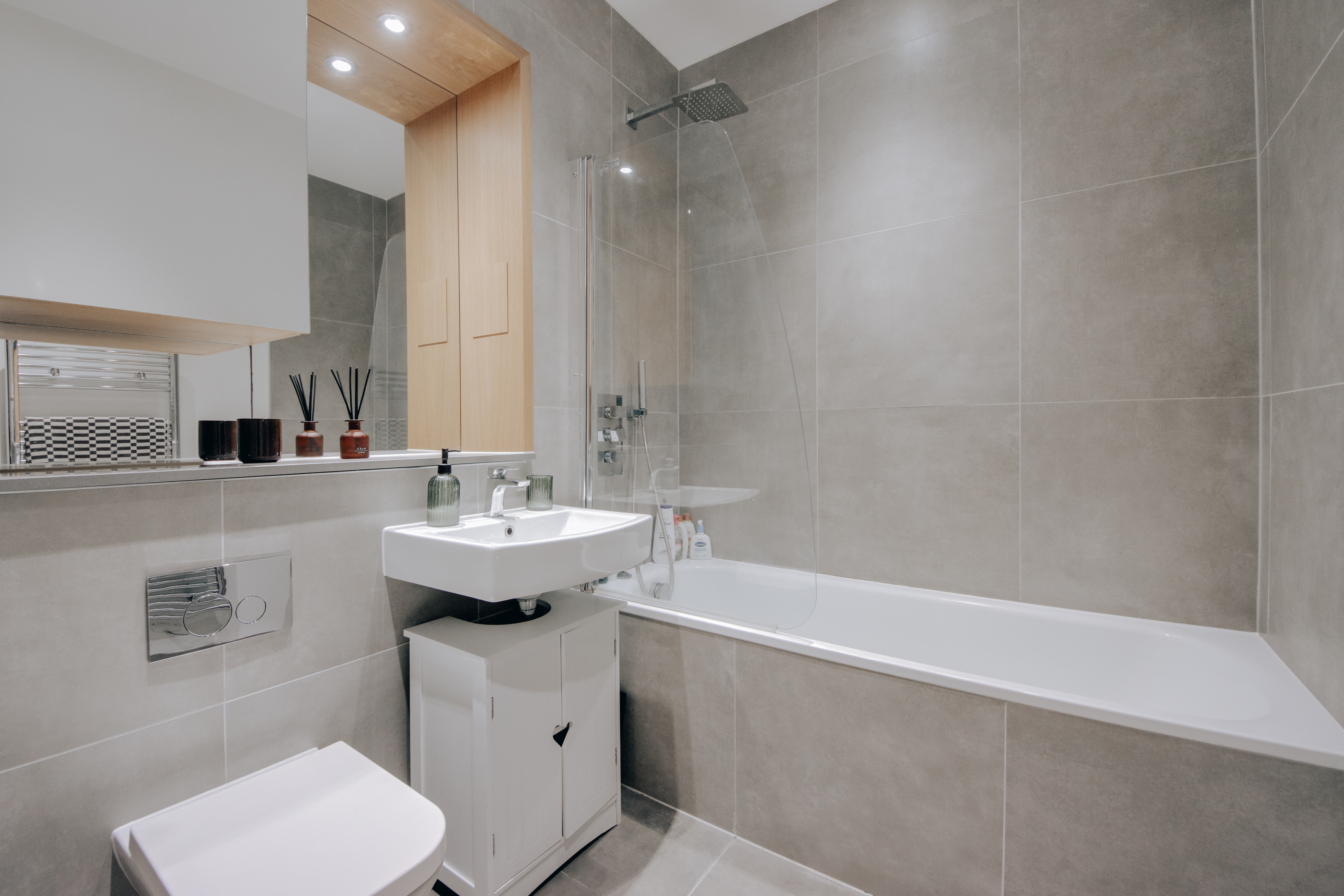 The 13ft bedroom feels calm and composed, with fitted cabinetry designed to maximise storage while keeping the space visually clean. The bathroom continues the refined palette with full height neutral tiling and contemporary fittings.