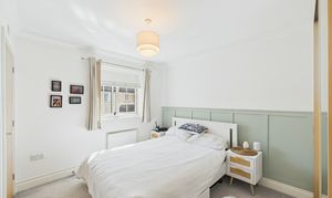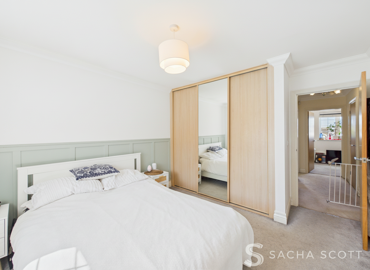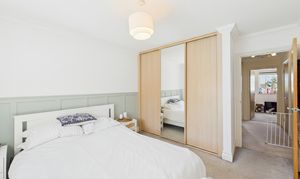 Neutrally presented, the primary bedroom offers a large fitted wardrobe, en-suite and modern panelling.