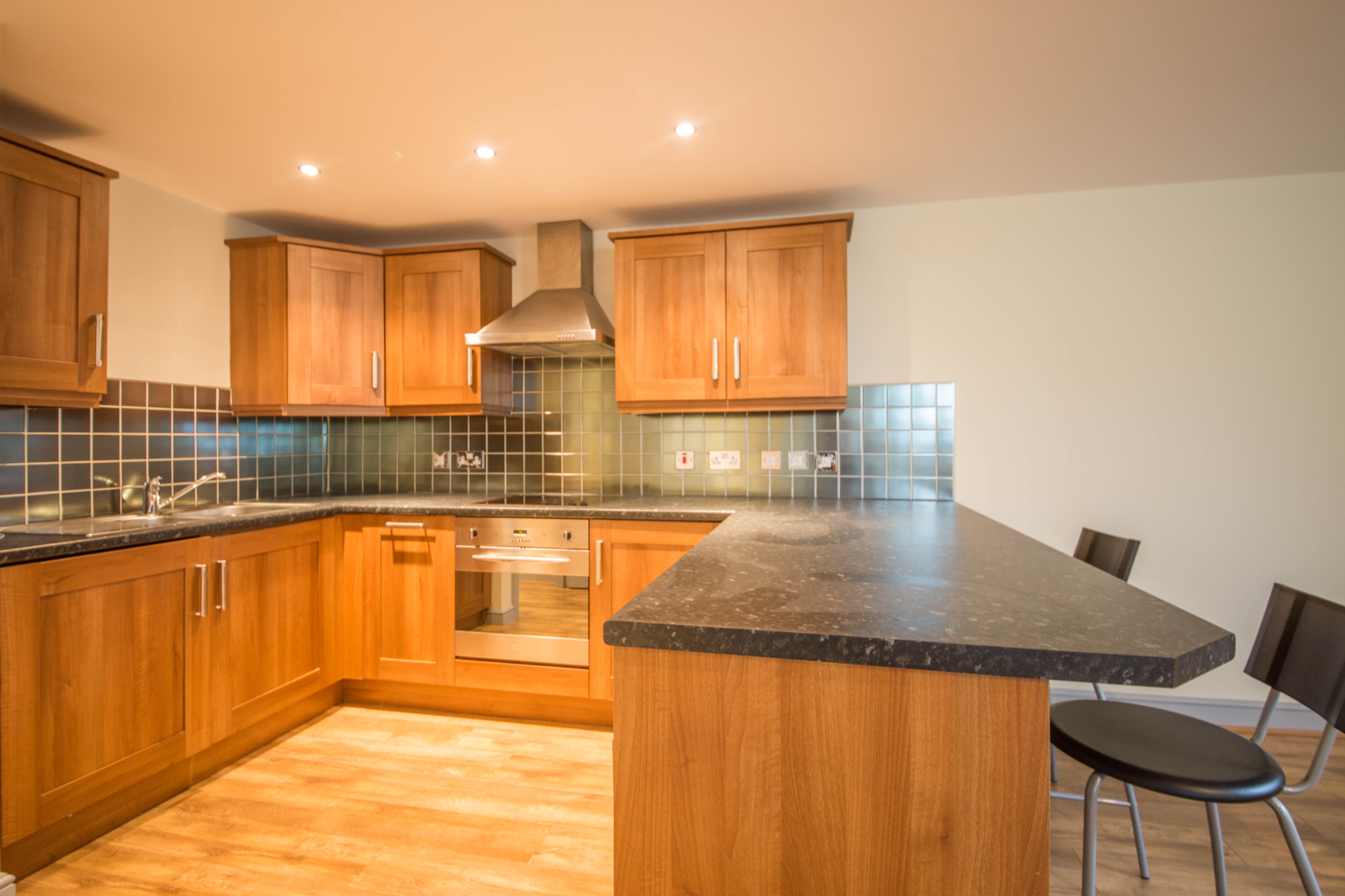 Open plan kitchen/living room. The modern kitchen is well equipped with integrated appliances, including an electric hob, oven, extractor hood, fridge, freezer, dishwasher, and a washing machine. Complemented by recessed lighting, wood flooring, and a breakfast bar.