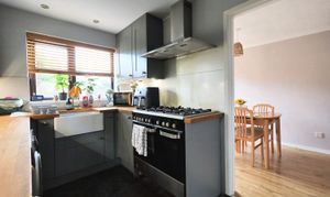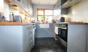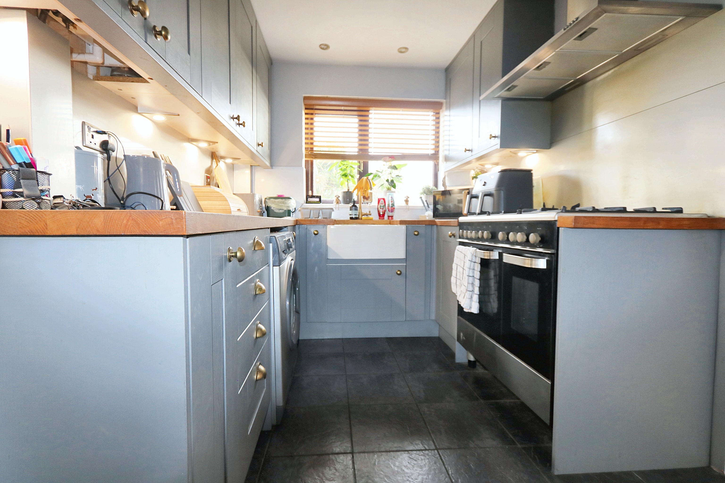 A refitted Wickes kitchen with rear uPVC window and side uPVC door to the drive area. The kitchen is very well appointed with matching units and these are complemented by natural wood worktops and a Belfast style sink with brass style mixer tap over. Freestanding range with 5 ring gas burner and double oven. Additional space for washing machine and US style fridge (these appliances are not to remain but are available by separate negotiation). Ceramic tiled flooring, contemporary metal splashback areas and a smooth ceiling with 8 recessed spotlights. Concealed boiler refitted in 2018.