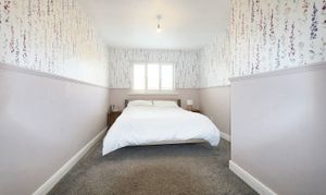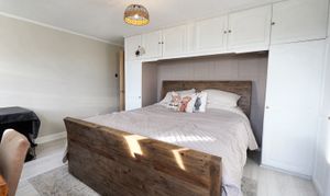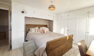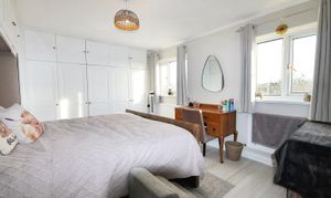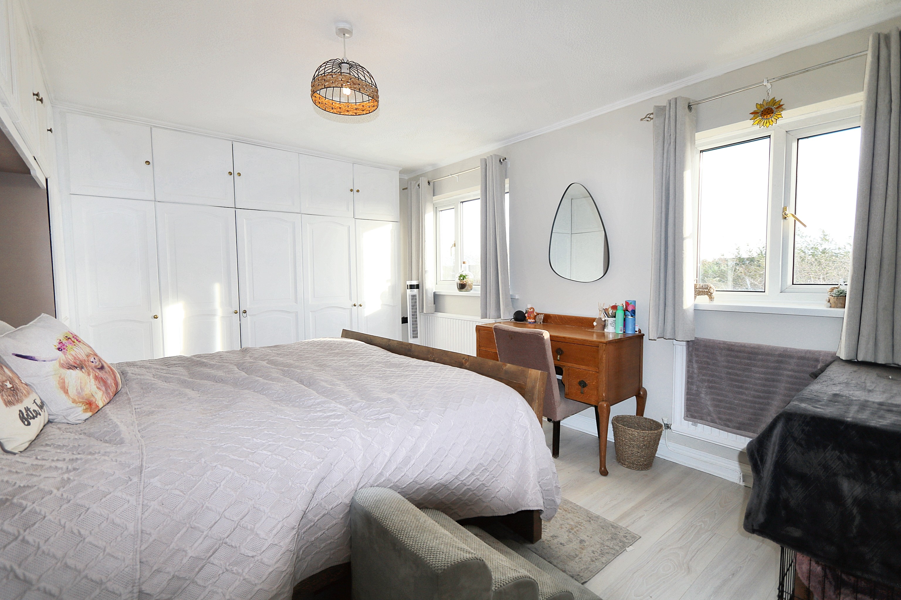 A large main bedroom which has two sets of rear uPVC windows, radiator and an off white laminated flooring. Great range of L-shape wardrobes and overbed fitments.