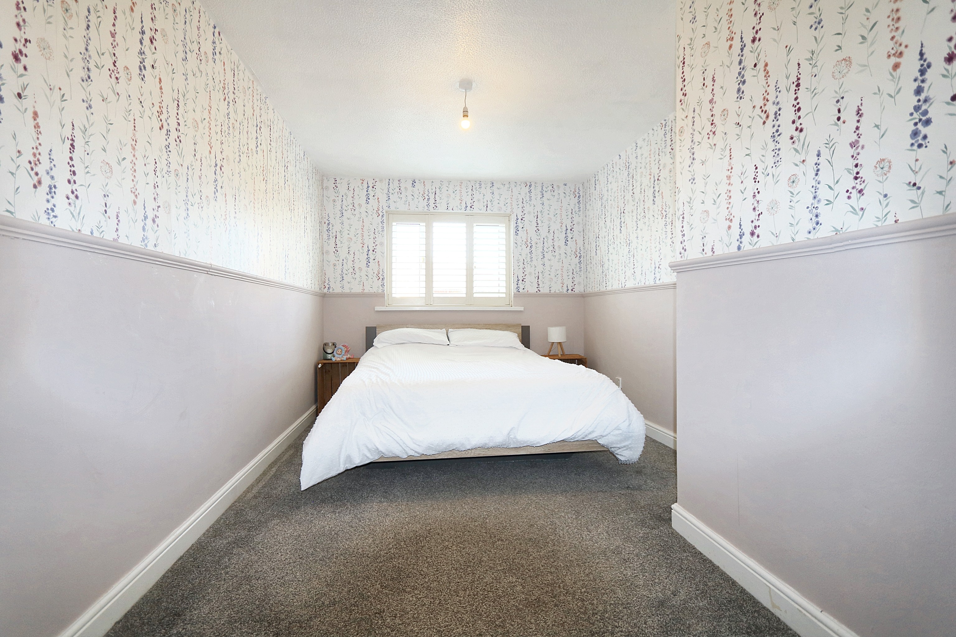 A carpeted double bedroom with front uPVC window with gold bar effect. Radiator.