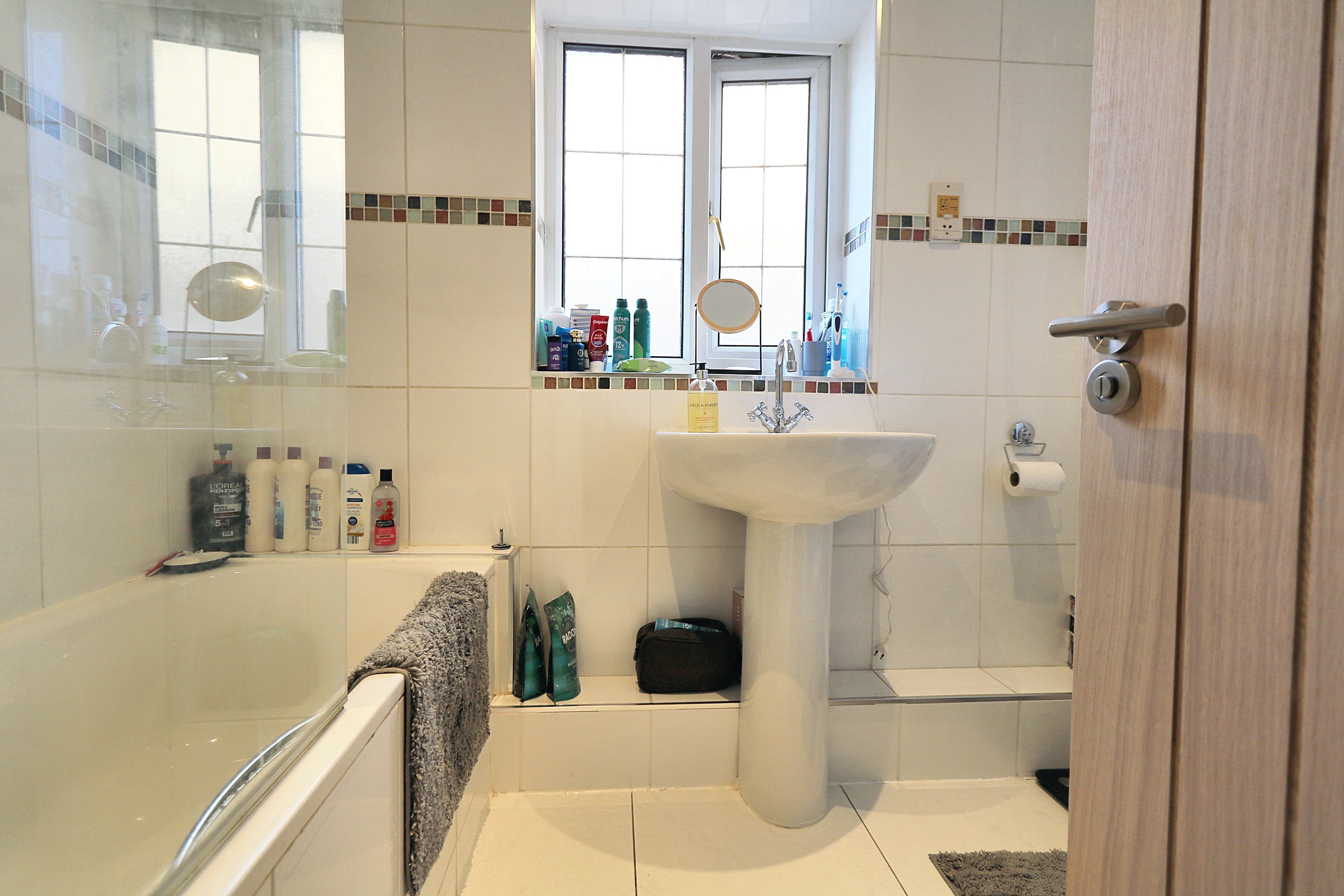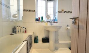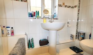 Immaculate and with a white suite comprising a close coupled WC, pedestal basin and bath with electric shower and glass screen over. Fully ceramic tiled walls, floor, splashbacks and sill with opaque side uPVC window with gold bar effect. Chrome heated towel rail and door to an airing cupboard which houses the hot water cylinder and some shelving.