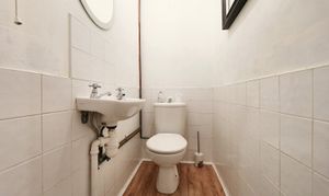 With a white close coupled WC and wall hung wash basin with tiled splashback. Laminate flooring.