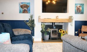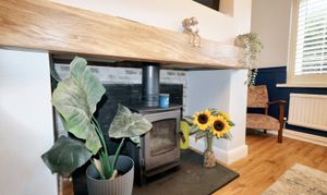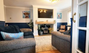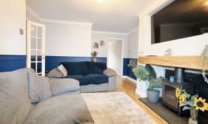 A super size and redecorated in 2025 with impressive media wall added, laminated flooring and a smooth ceiling. There are front uPVC windows with gold bar effect, radiator and a wood burning stove mounted on a slate hearth. A modern Oak door leads to the dining room.