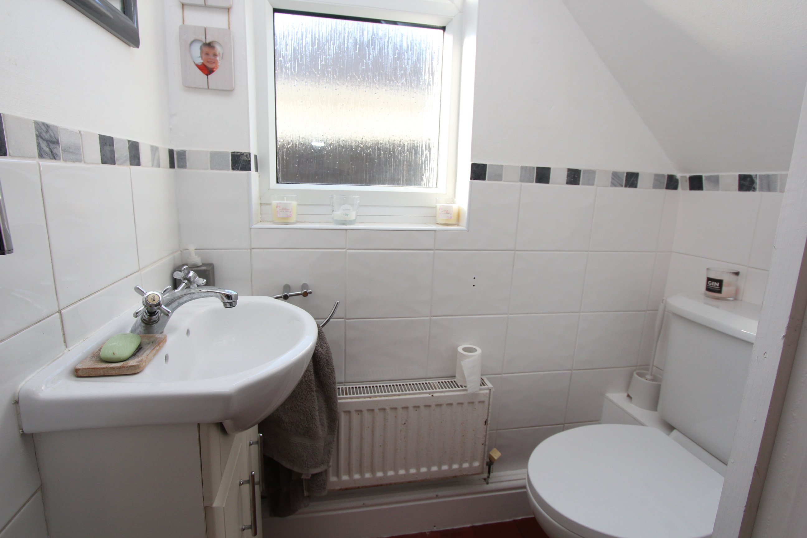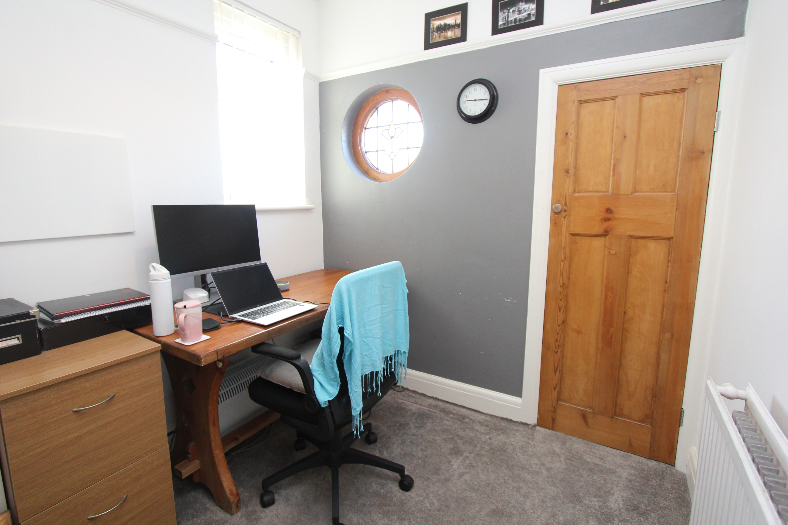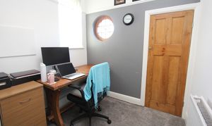Carpeted single bedroom ideal and currently used as an office but could function as a bedroom. Side uPVC window, radiator and picture rail. Pine door leads to handy storage cupboard - houses the fuse box and meter. Final feature port hole style window (wooden surround with stained glazing).