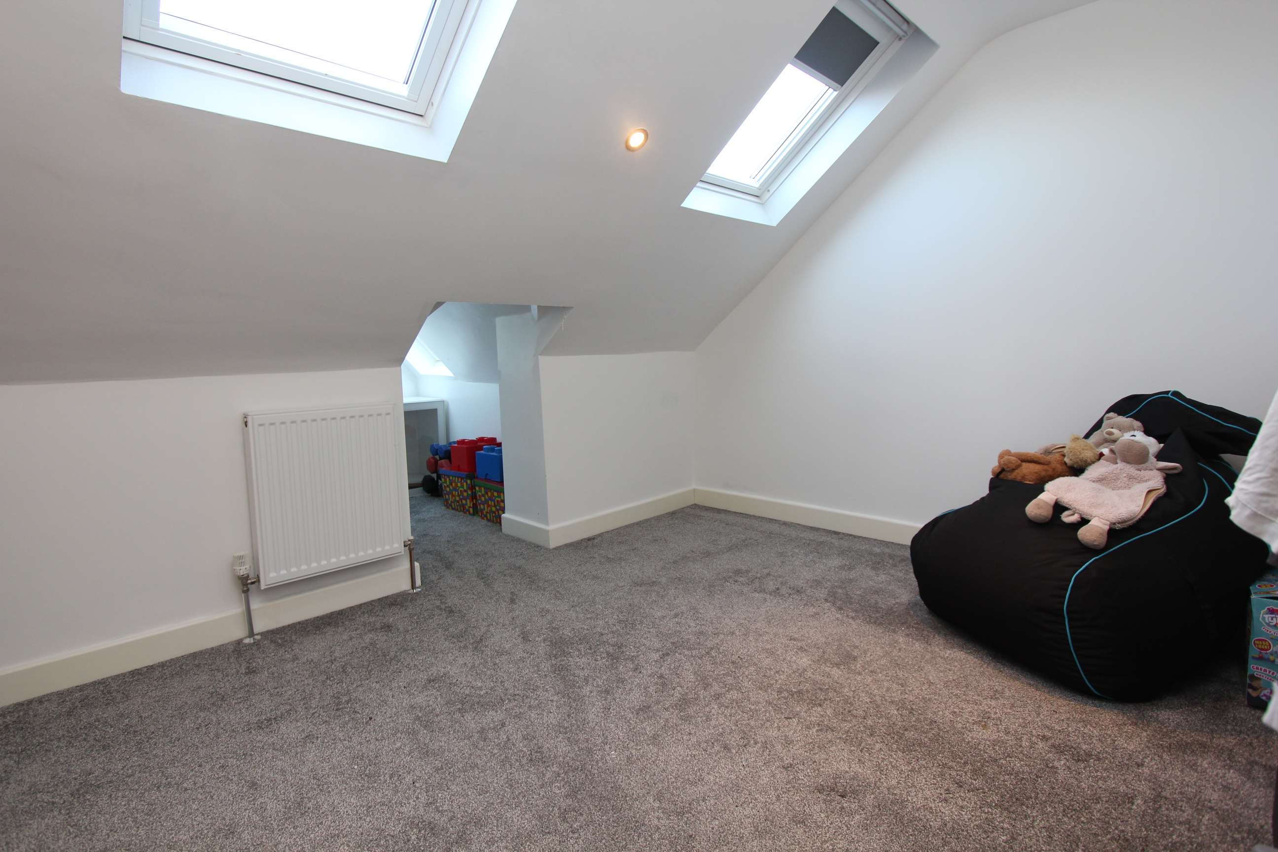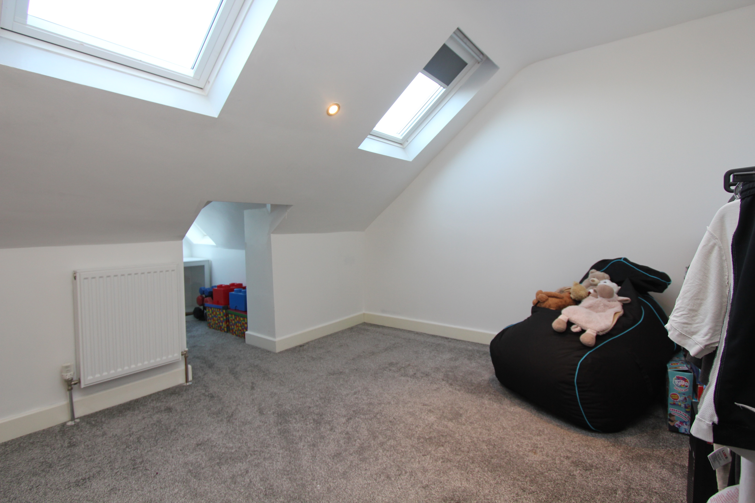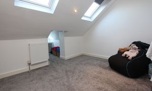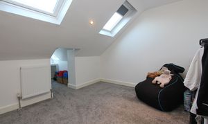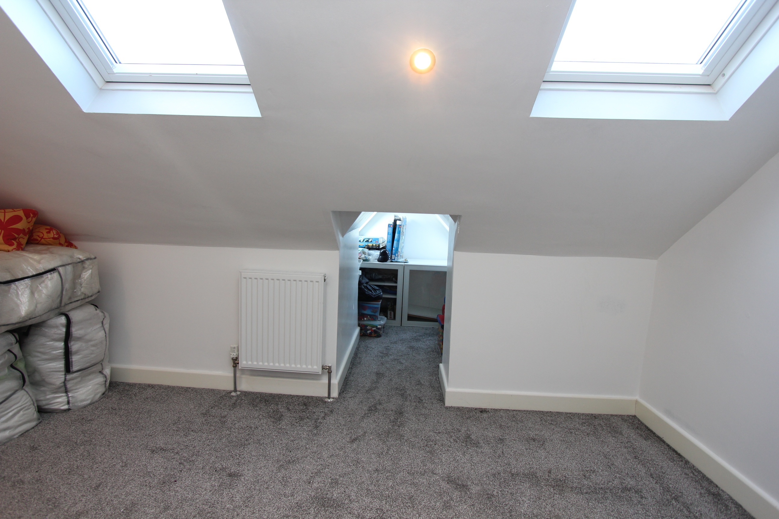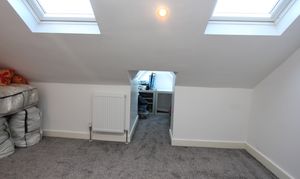 The smaller dimension is taken at waist level. Carpeted bedroom with radiator and two front Velux double glazed windows plus two further recessed windows (fire escape). It is big enough for a double bed if required. Smooth ceiling with recessed spot lights. Radiator. Additional recessed are excluded from dimensions given - ideal for general storage.
