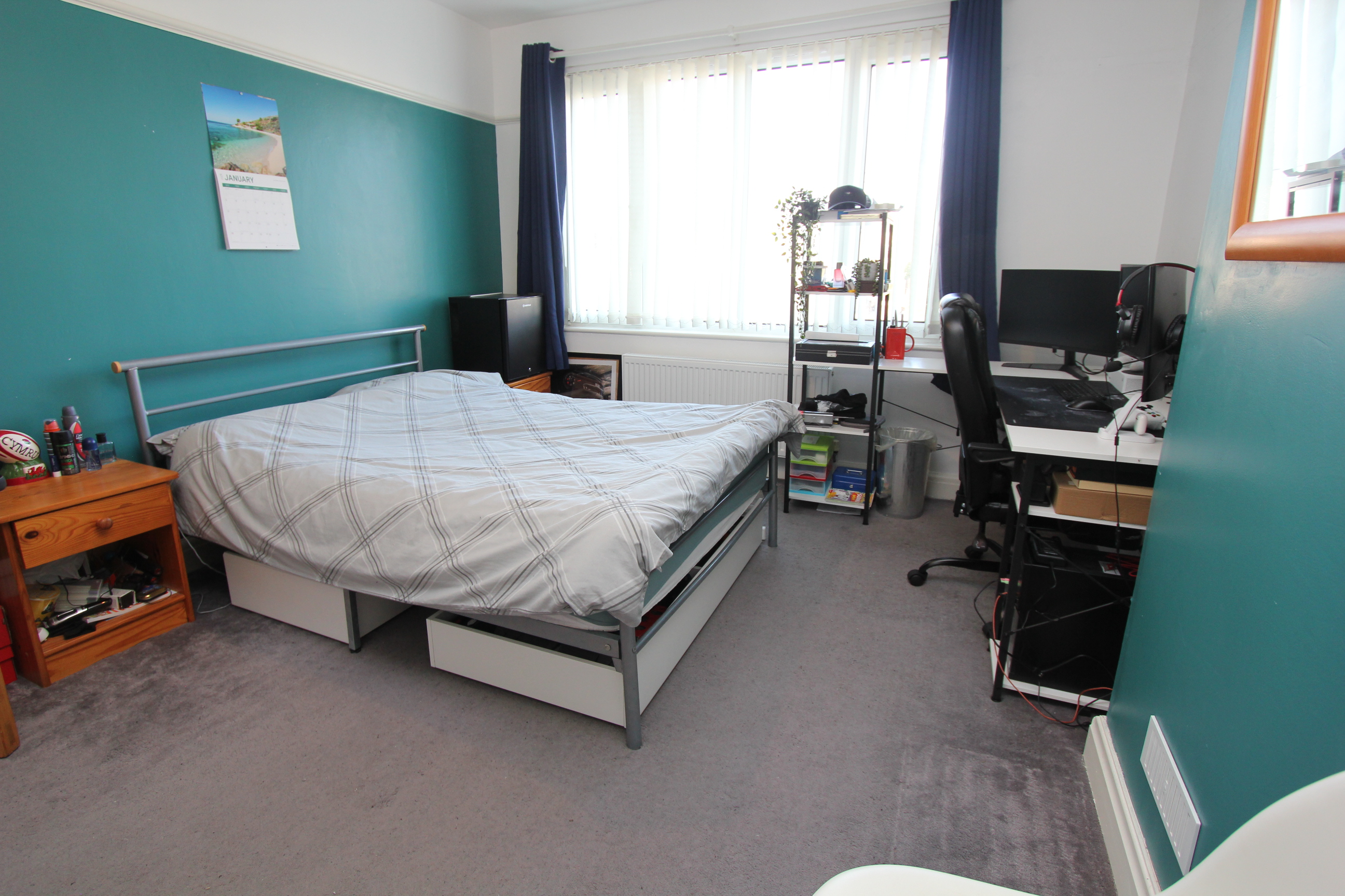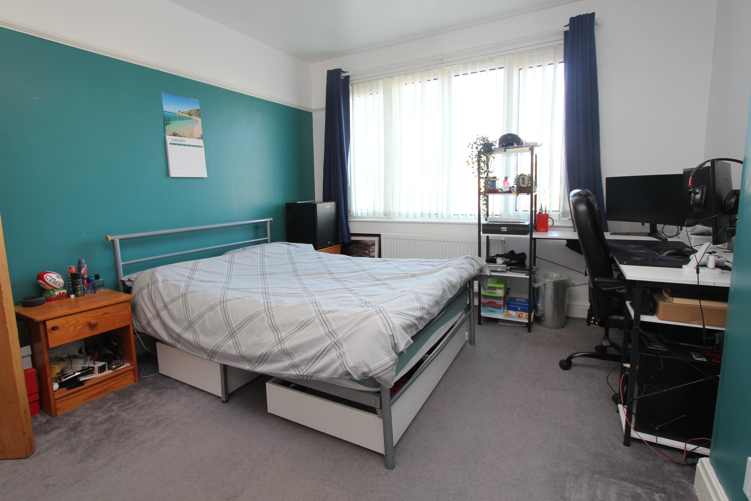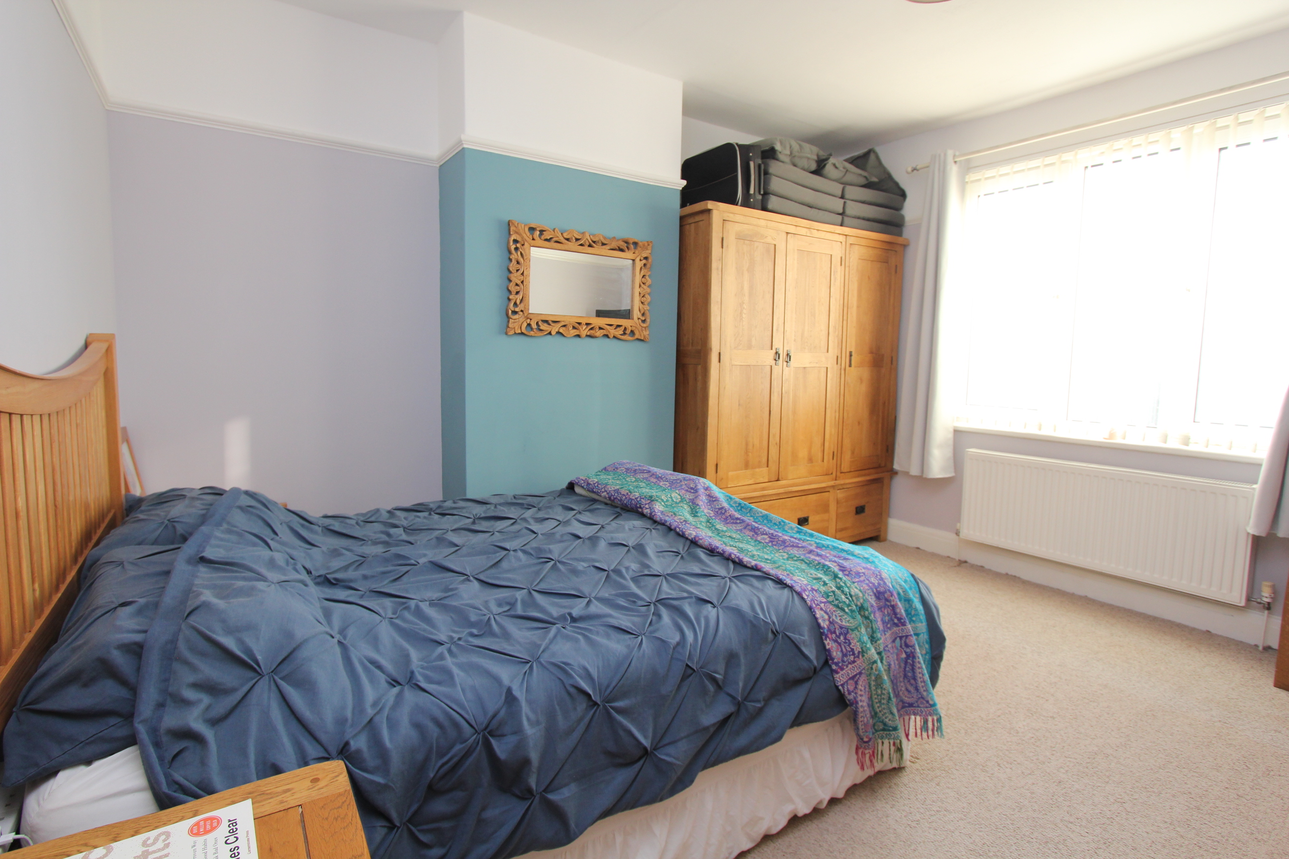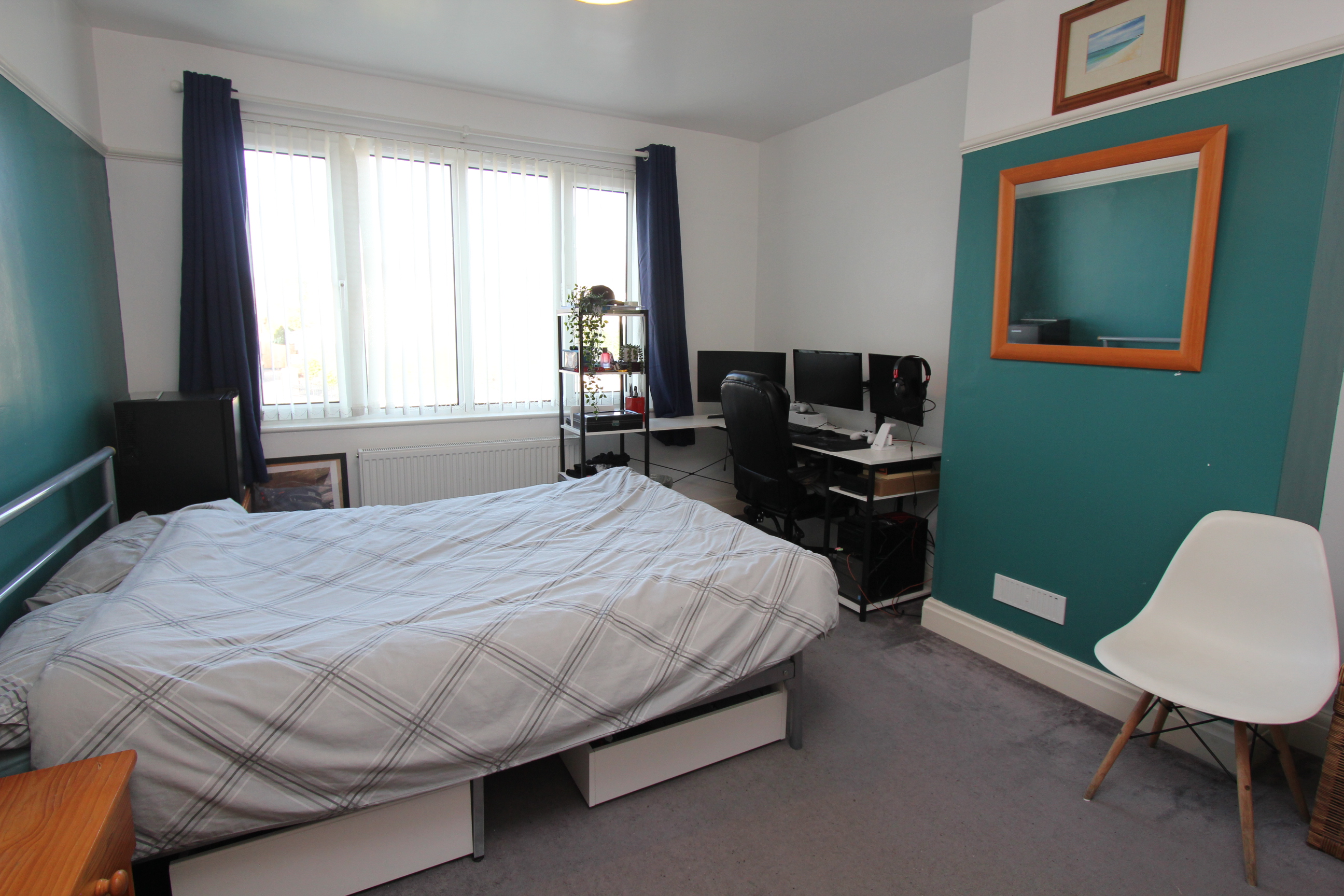Carpeted double bedroom with picture rail, smooth ceiling, radiator and rear uPVC window with Channel glimpses.