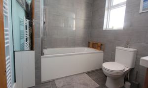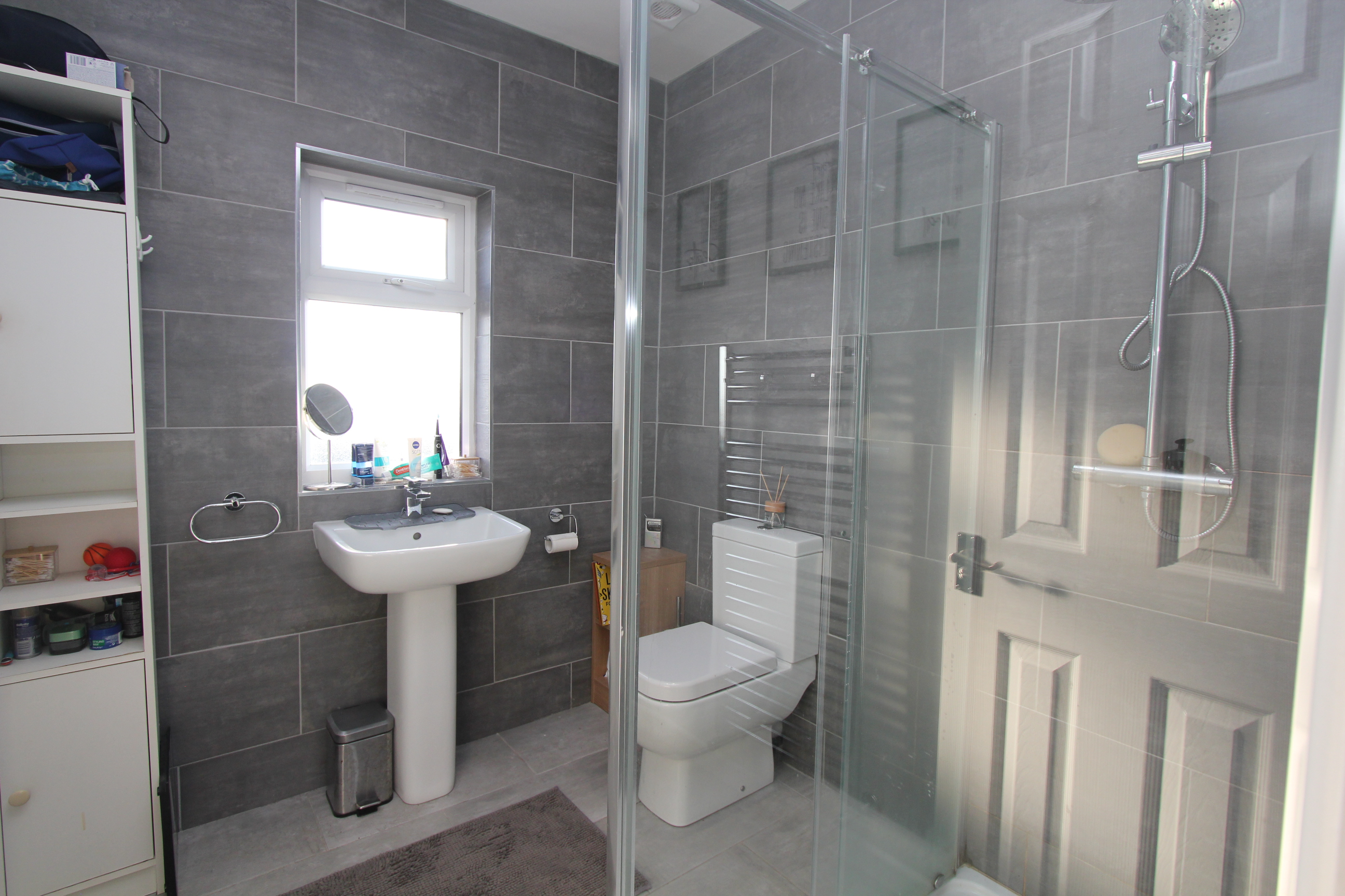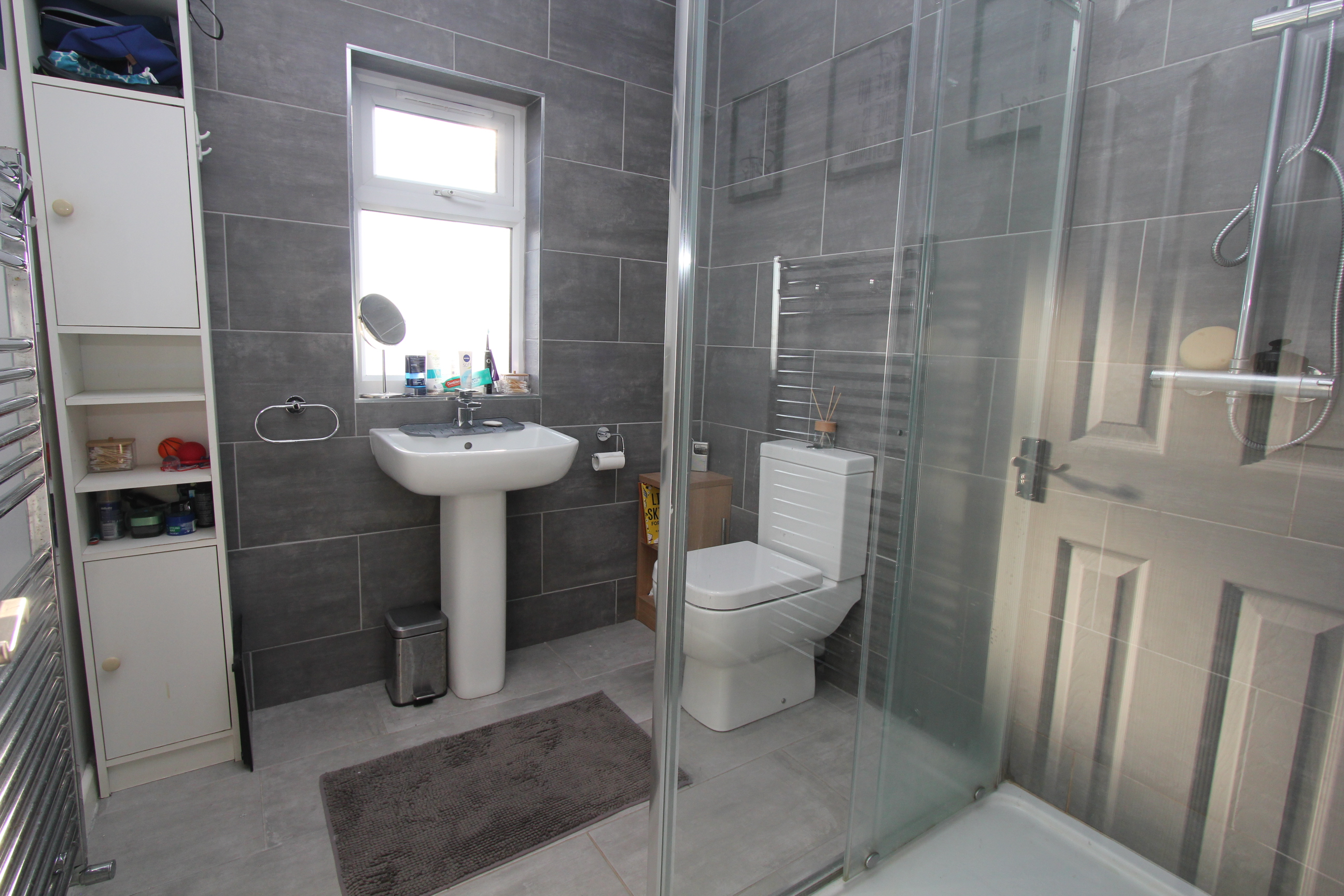 Immaculate shower room serving two double bedrooms on this floor. Comprising white close coupled WC, pedestal basin and double walk in shower cubicle (fully tiled) with fixed rainfall style head and adjustable rinse unit. Chrome heated towel rail. Obscure rear window. Smooth ceiling with two recessed spot light and extractor. Ceramic tile flooring (with underfloor heating) and splash backs areas