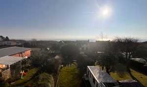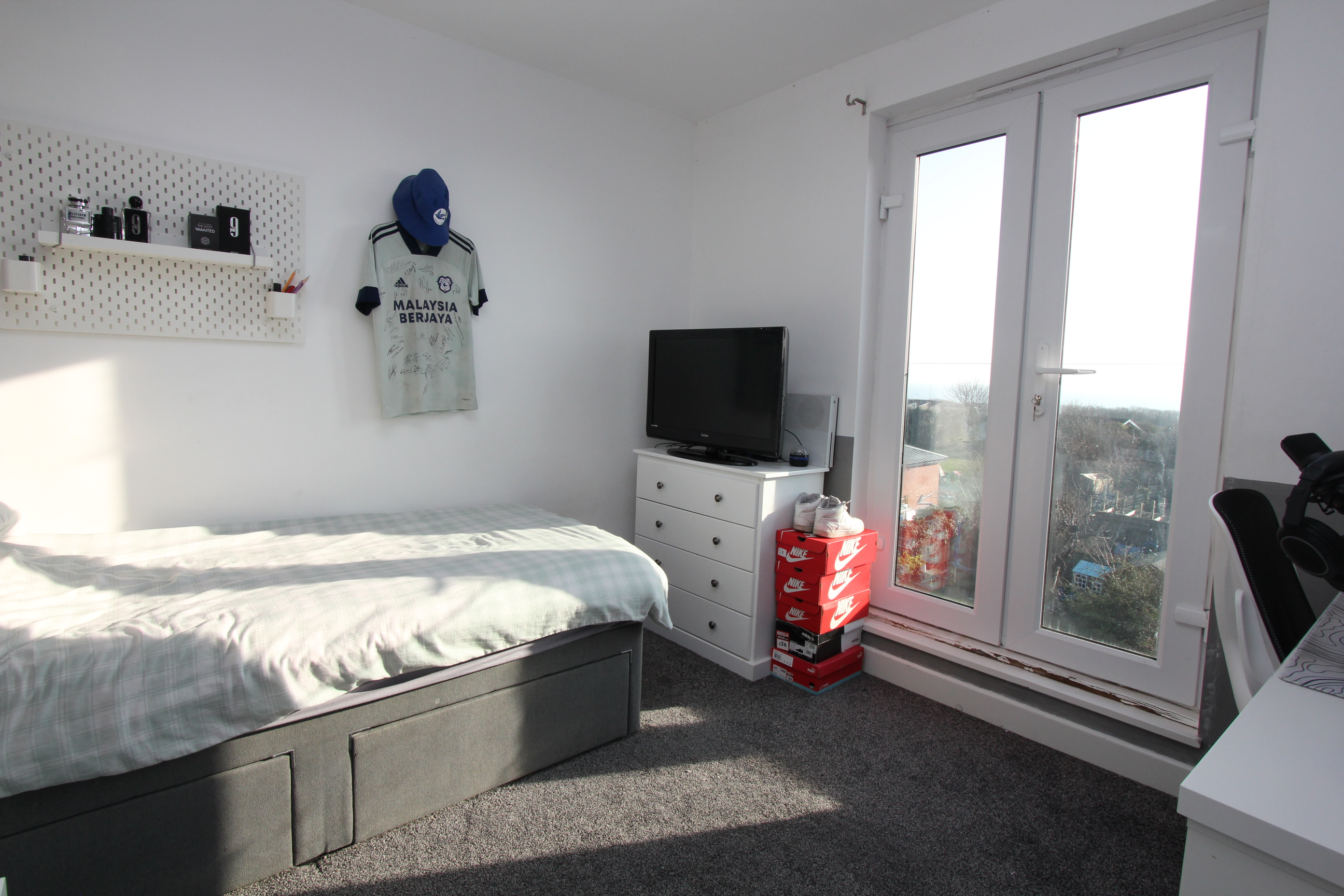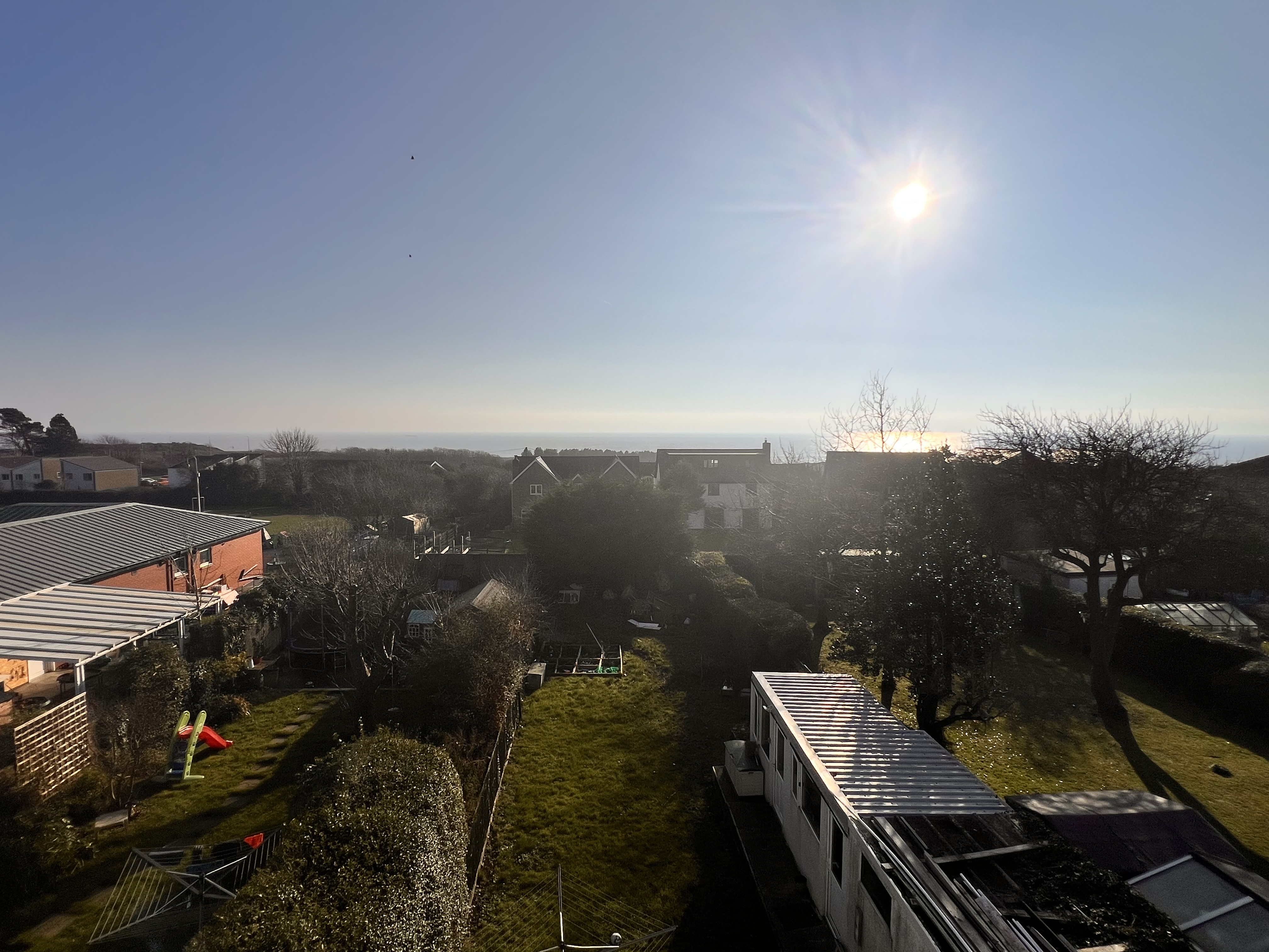 Carpeted double bedroom with smooth ceiling and four recessed spot lights. Radiator. French uPVC doors which have a glass Juliet style balcony offering Channel views.
