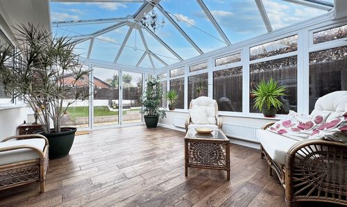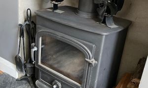 With continuation of the block flooring from the hall and with a focal point of a multi fuel burner mounted on a slate hearth with wooden style concrete mantel over. Aluminium double glazed sliding doors give access to the large rear garden and open access leads through to the modern kitchen. Radiator and smooth coved ceiling.