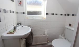 Comprising white close coupled WC and wash basin with vanity cupboard under. Quarry tile flooring and side obscure window. Radiator.