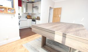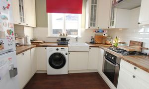 Farmhouse style kitchen with a range of cream eye level and base units with complementing wood work tops over. Integrated 4 ring gas hob with electric oven under and cooker hood over. Square Belfast sink. Integrated dishwasher and space for washing machine and tall fridge freezer. Side window and ceramic tile splash backs. High quality vinyl flooring and smooth coved ceiling.