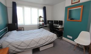 Carpeted double bedroom with front uPVC window, radiator and smooth ceiling. Picture rail.