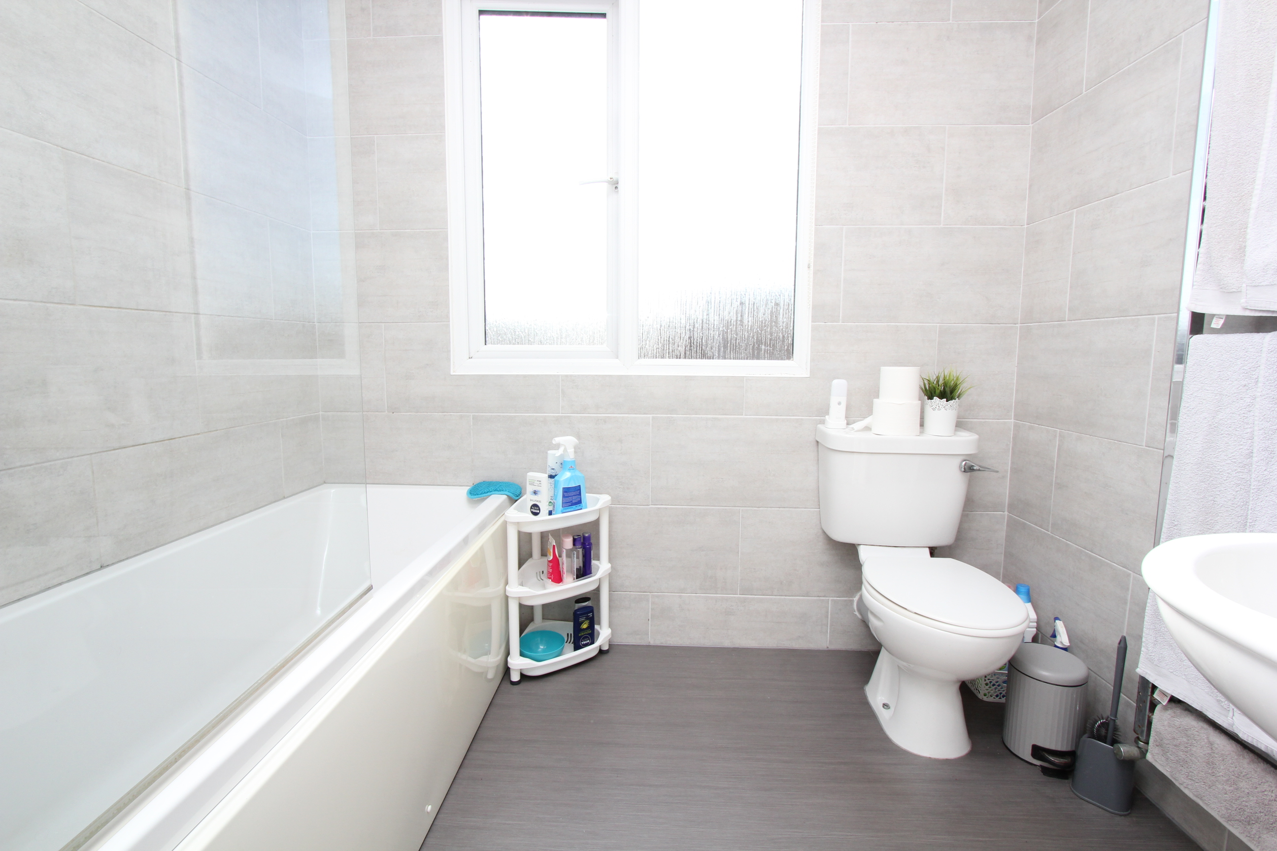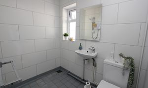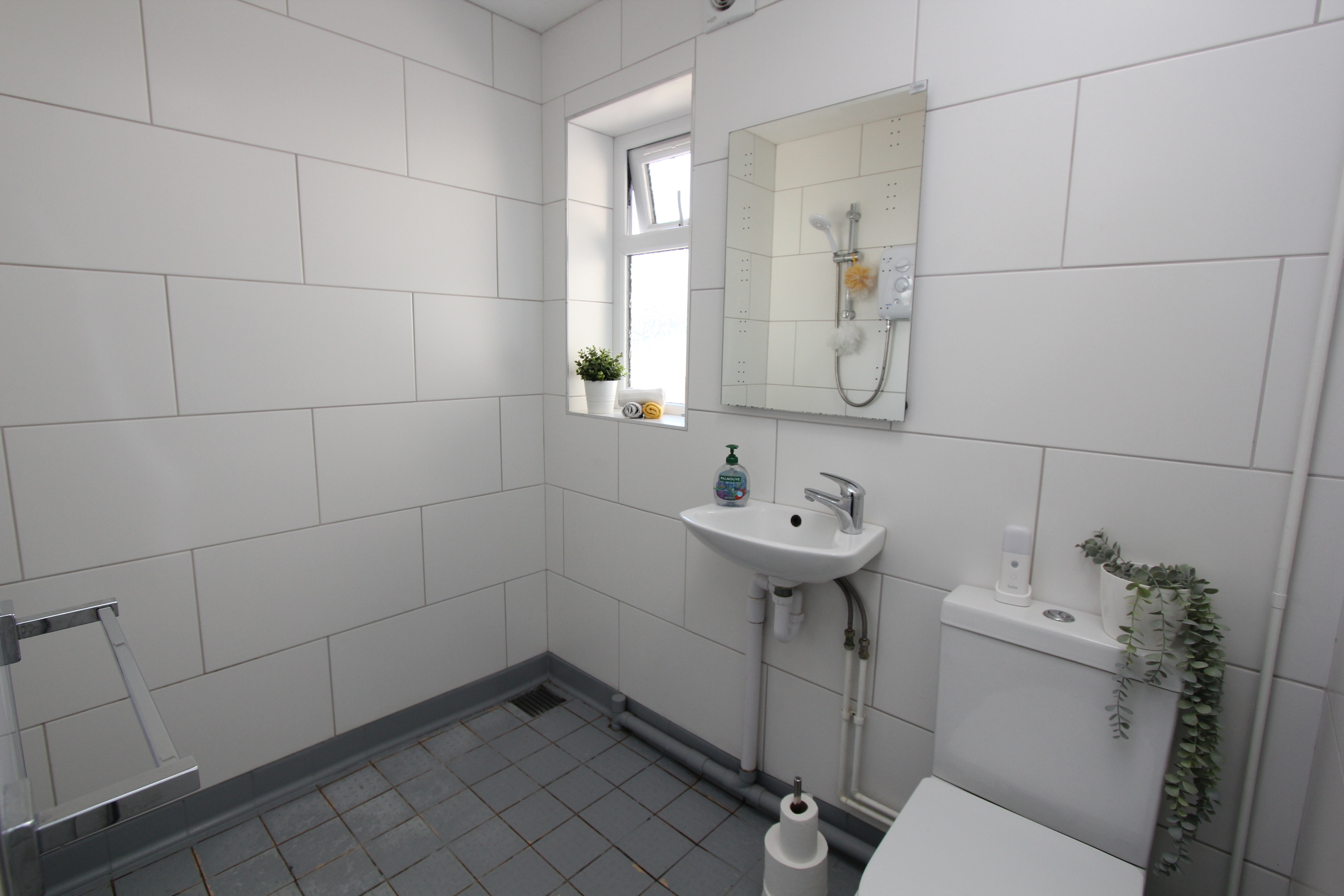 With a tiled flooring and ceramic tiled walls, a white suite comprising close coupled WC, wall hung wash basin and electric shower. Obscure rear uPVC window. Mirror with lighting. Door to storage cupboard.
