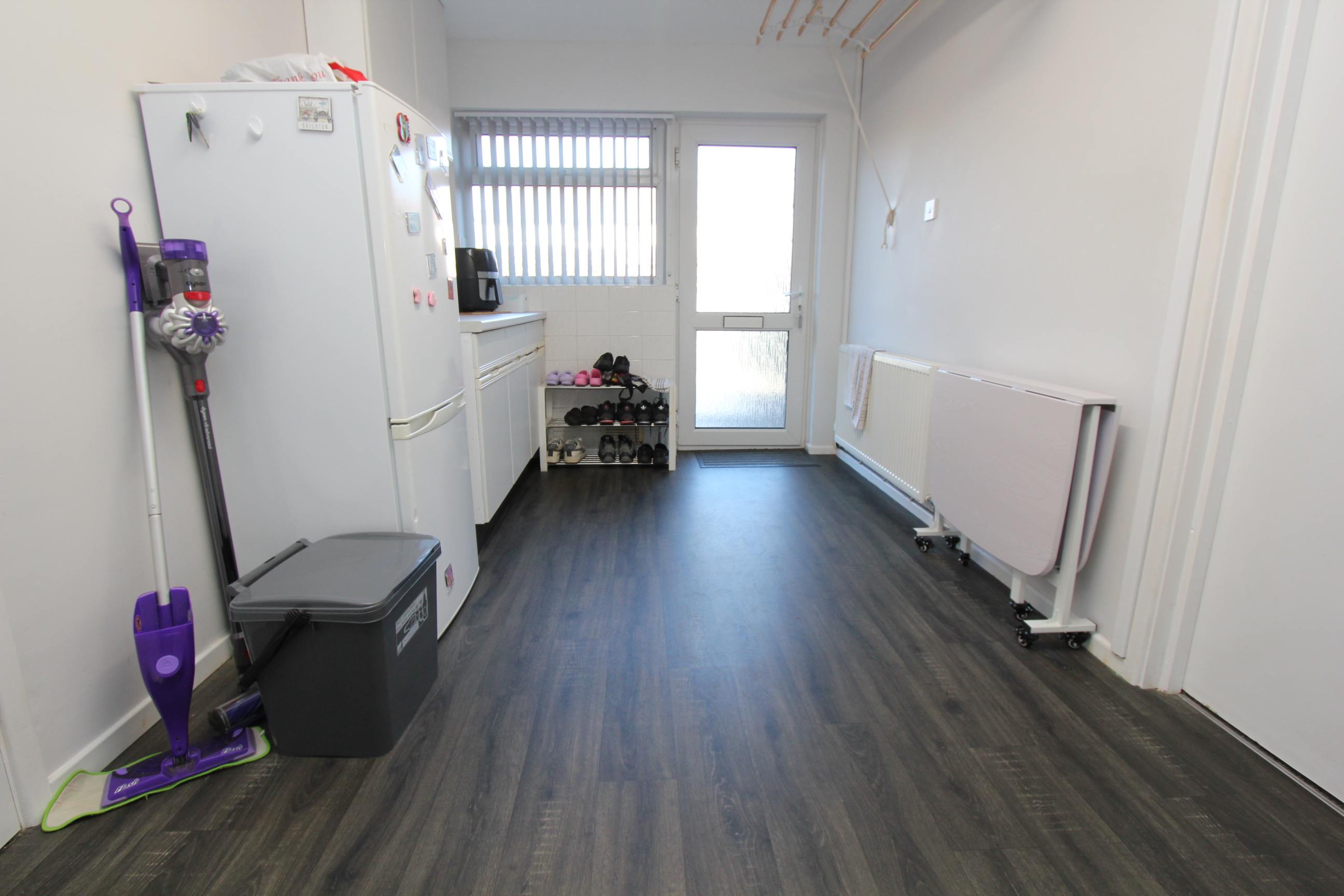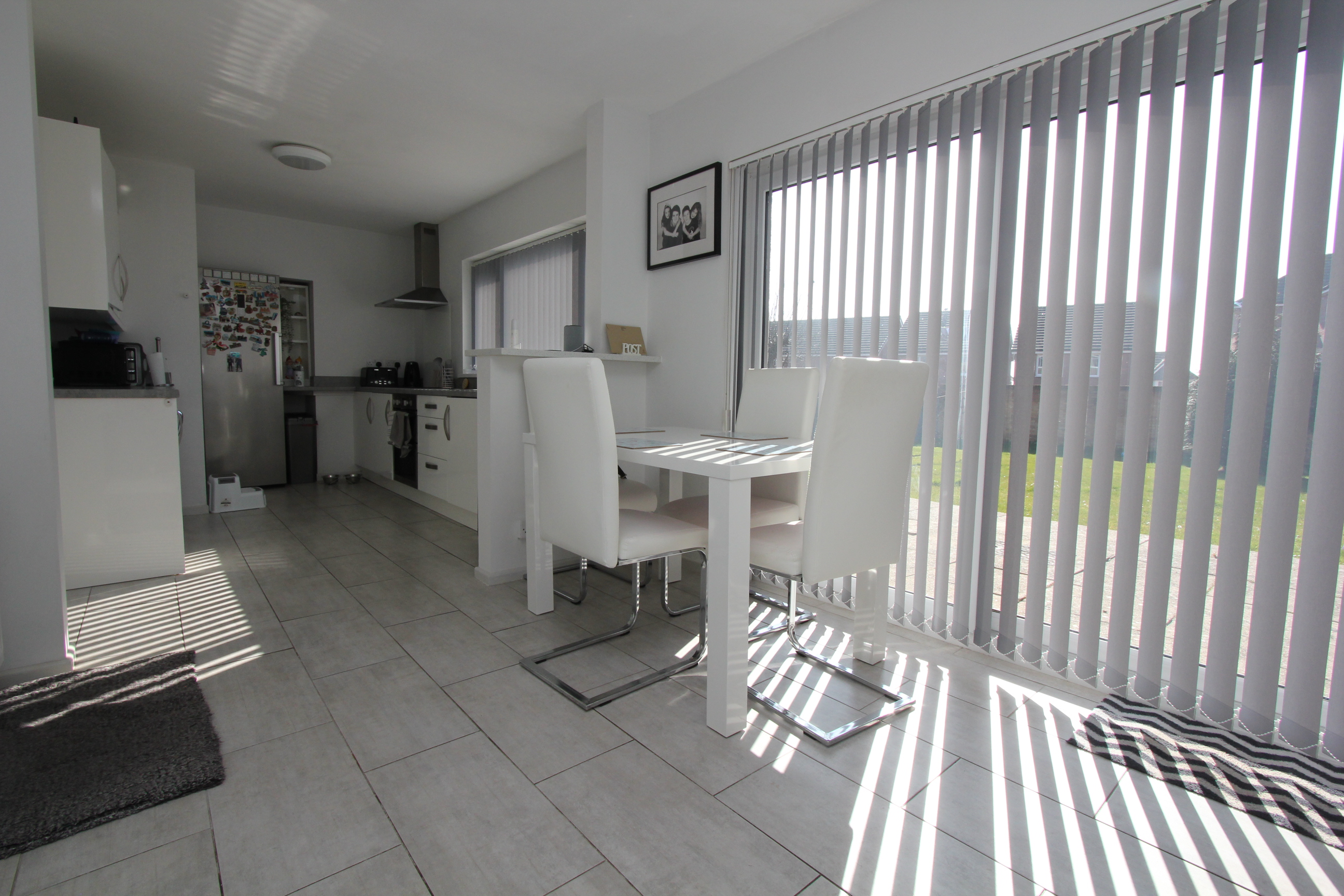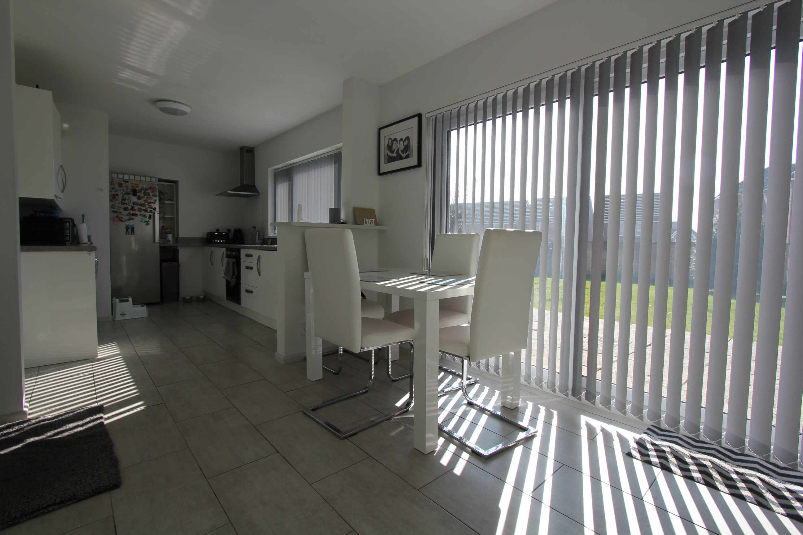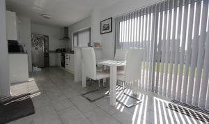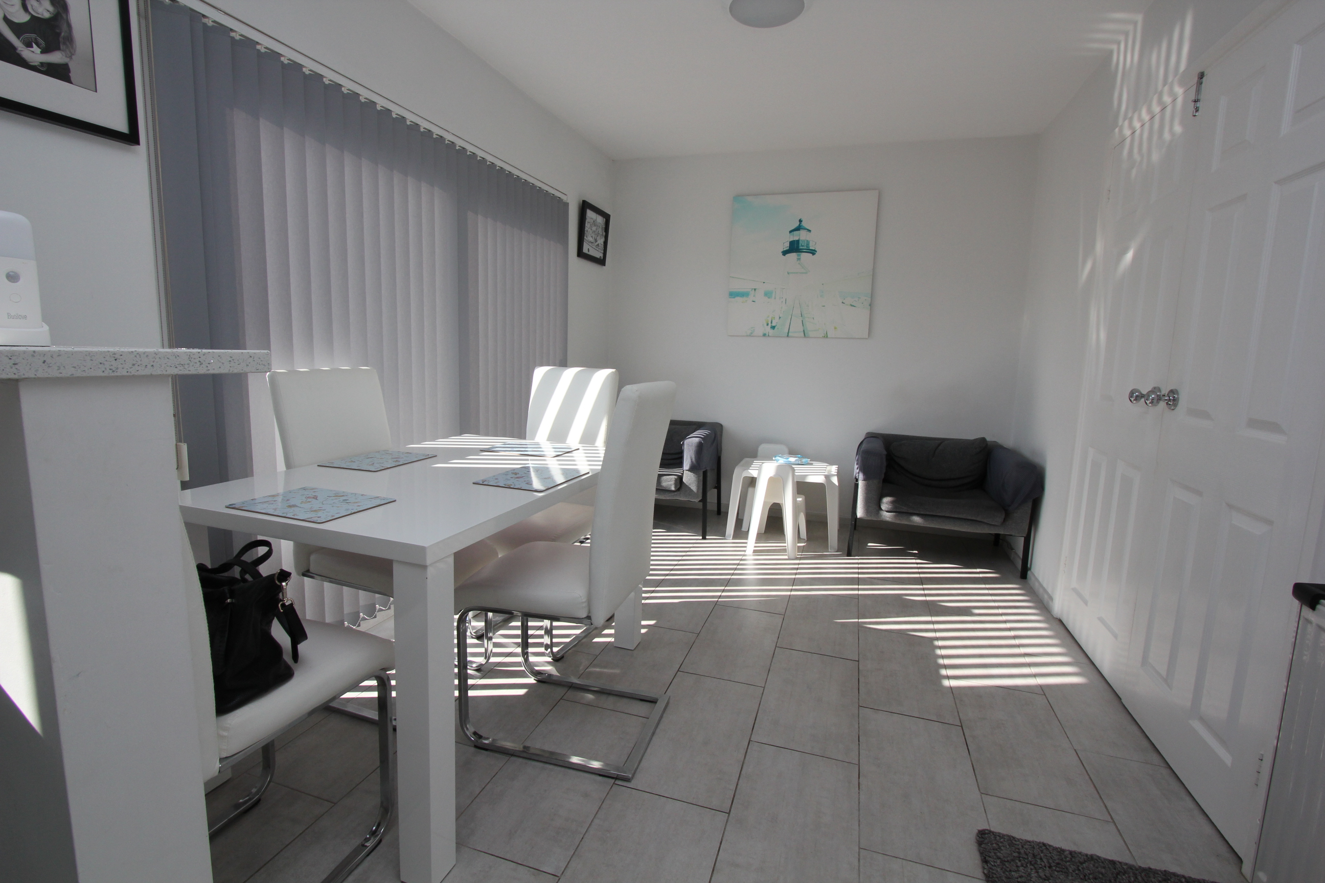 With a stylish ceramic tiled flooring throughout and is divided into two areas. The kitchen is well appointed with matching high gloss white eye level and bae units - these are complemented by modern work tops - matching splash back trim and a stainless steel sink unit with mixer tap. Integrated appliances include 4 ring ceramic hob, extractor hood over plus under counter double oven with grill. Freestanding fridge to remain and there are further slot in spaces for further appliances as required. Rear uPVC window looking onto the large rear garden. The remainder of the room is ideal for dining space and has sliding doors to the garden. Radiator. Return door to living room.