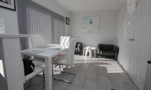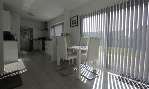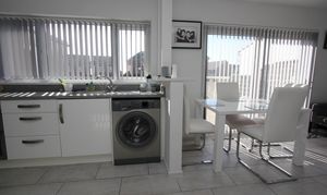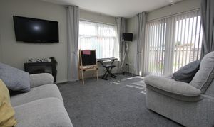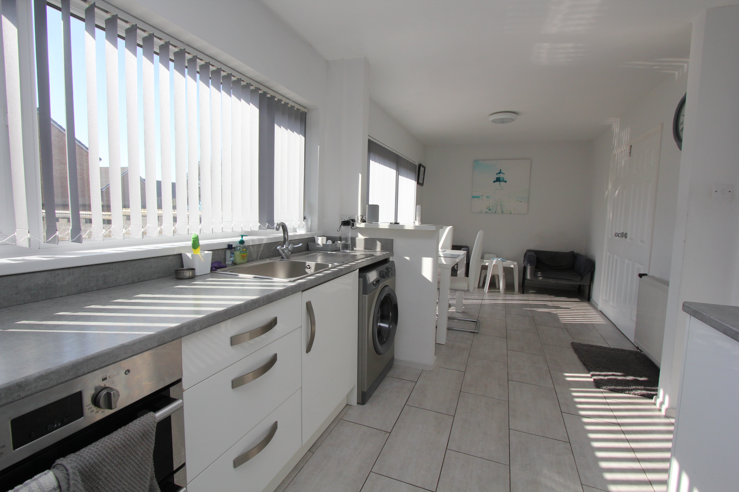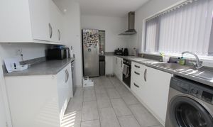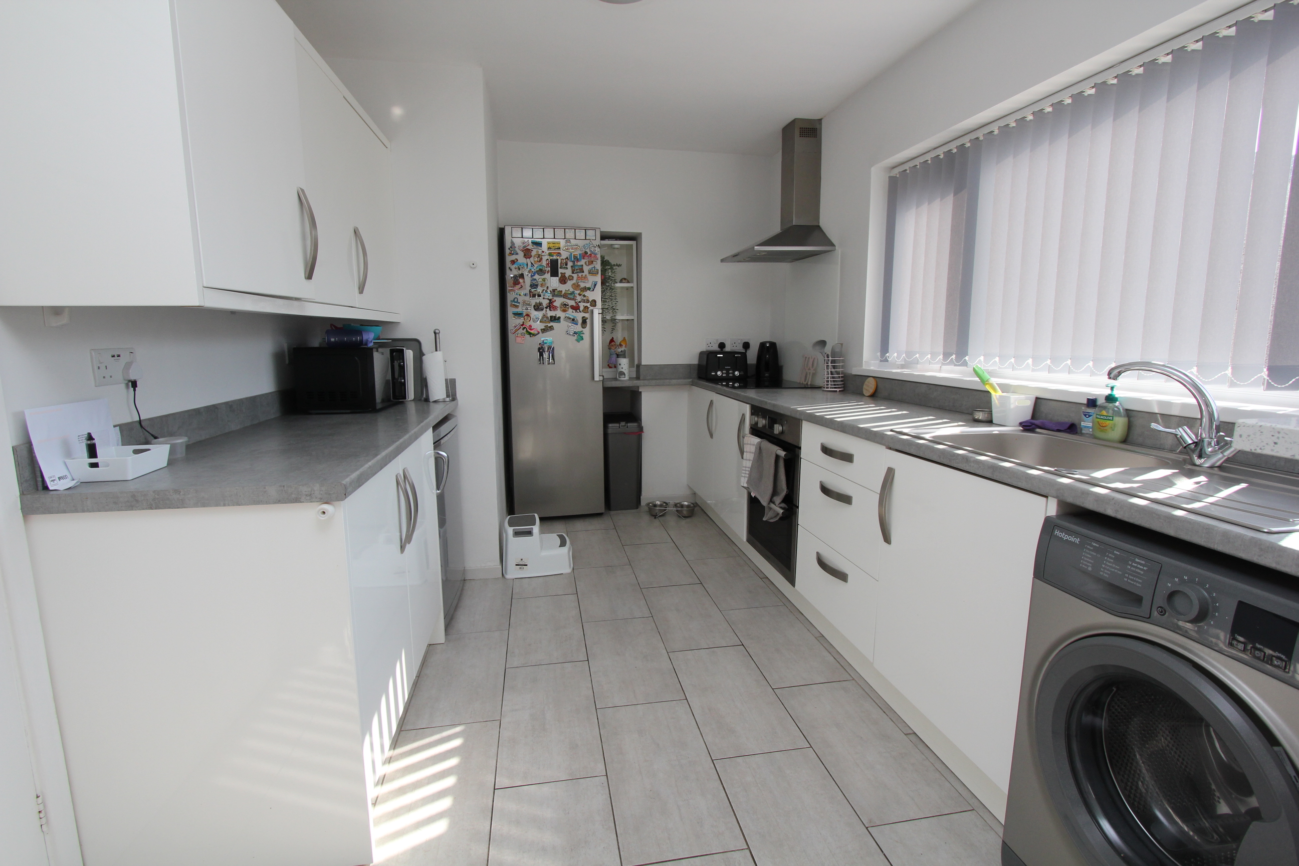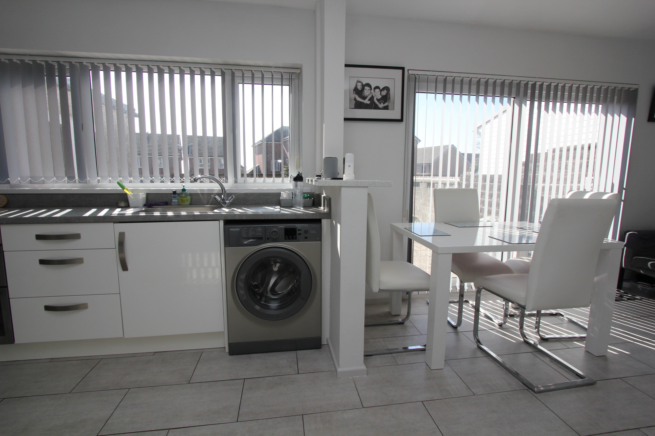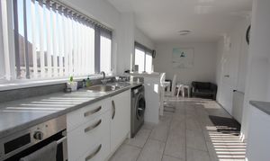 With a stylish ceramic tiled flooring throughout and is divided into two areas. The kitchen is well appointed with matching high gloss white eye level and bae units - these are complemented by modern work tops - matching splash back trim and a stainless steel sink unit with mixer tap. Integrated appliances include 4 ring ceramic hob, extractor hood over plus under counter double oven with grill. Freestanding fridge to remain and there are further slot in spaces for further appliances as required. Rear uPVC window looking onto the large rear garden. The remainder of the room is ideal for dining space and has sliding doors to the garden. Radiator. Return door to living room.
