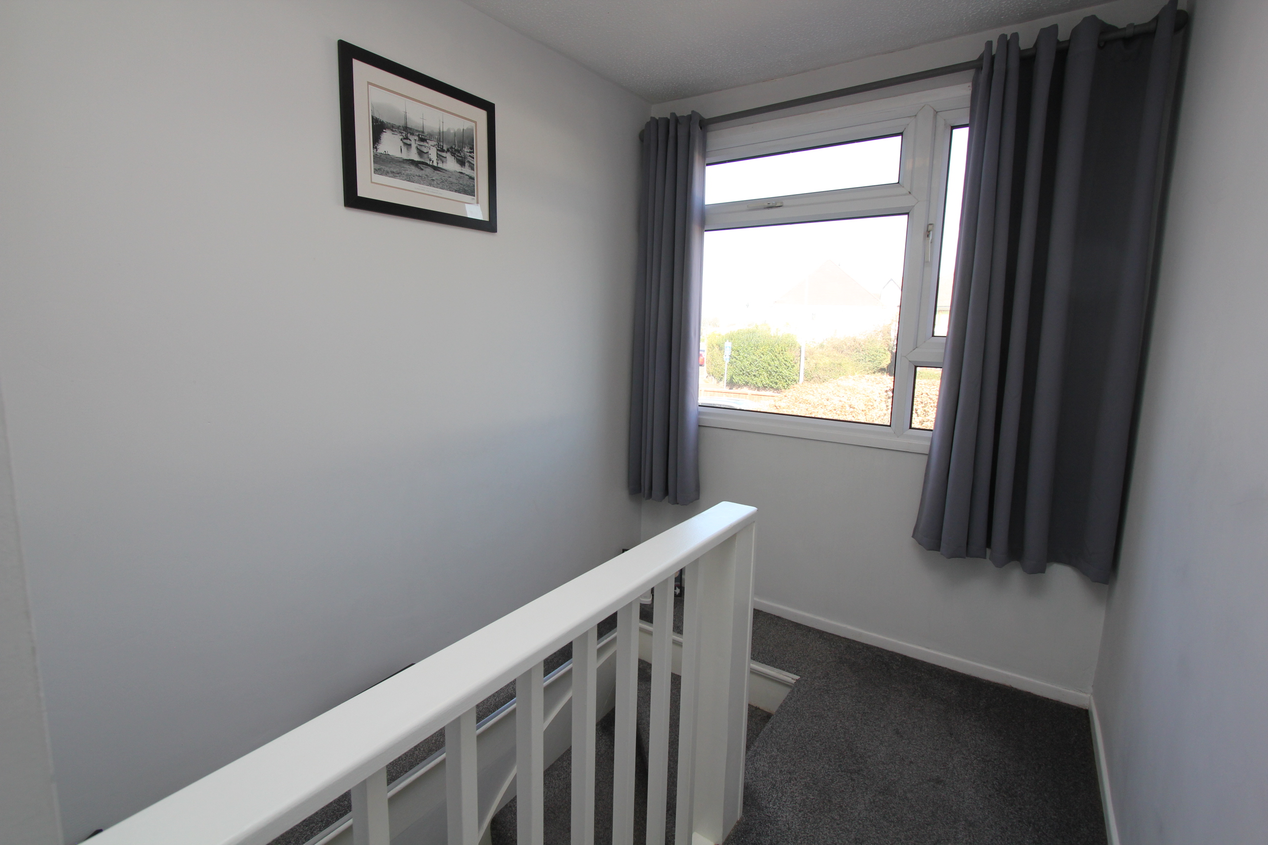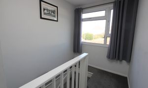 Carpeted landing with front uPVC window, LED light and matching doors giving access to the four bedrooms and bathroom. Additional full height storage cupboard with slatted shelving and radiator. Drop down loft hatch - partly boarded.