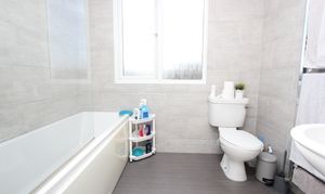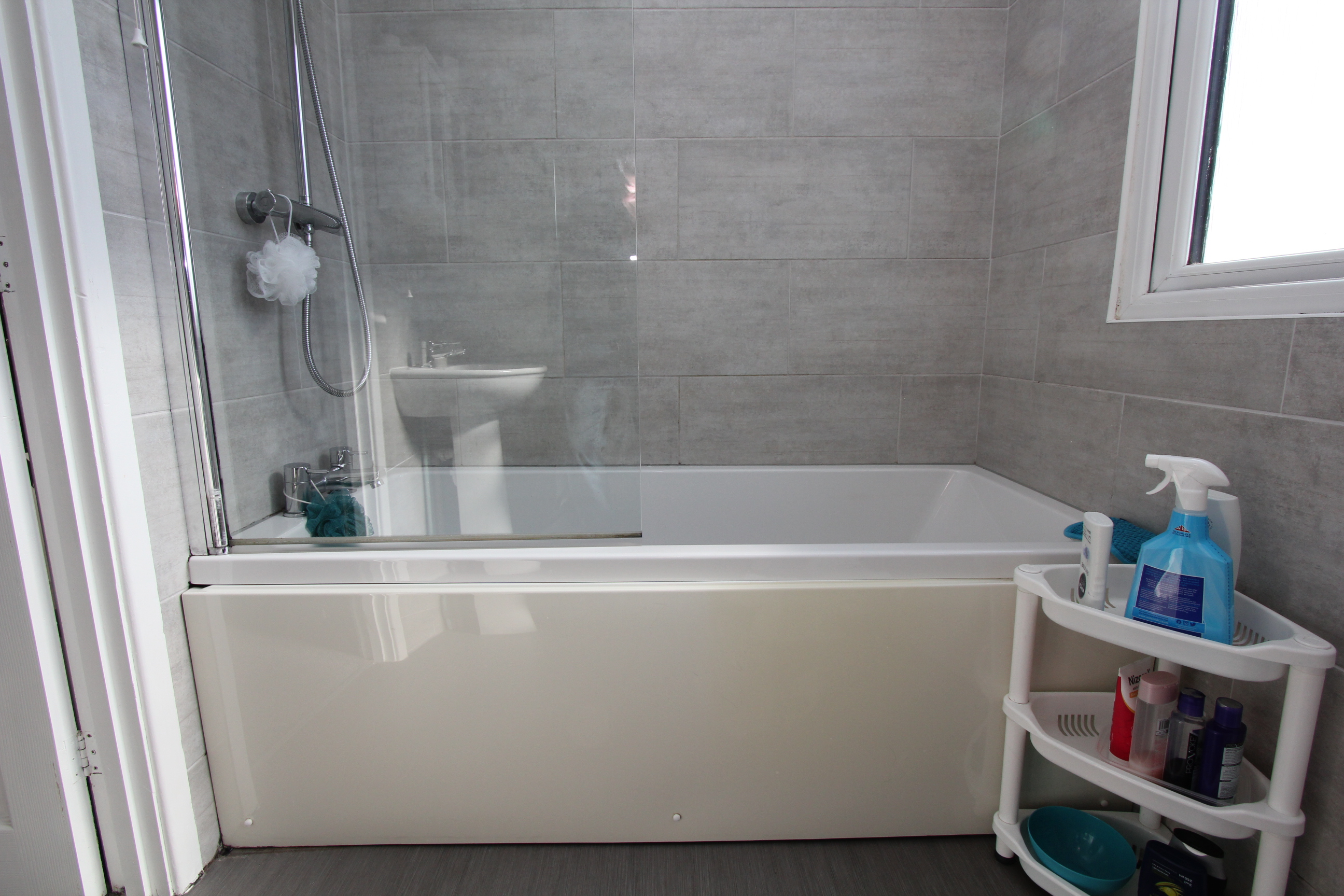 With vinyl flooring plus ceramic tiled walls and splash backs, the bathroom comprises a white suite with close coupled WC, basin and bath with thermostatic shower over - fixed rainfall head and adjustable rinse unit. Chrome ladder style heated towel rail. Obscure uPVC window. Cosmetics mirror fronted cabinet