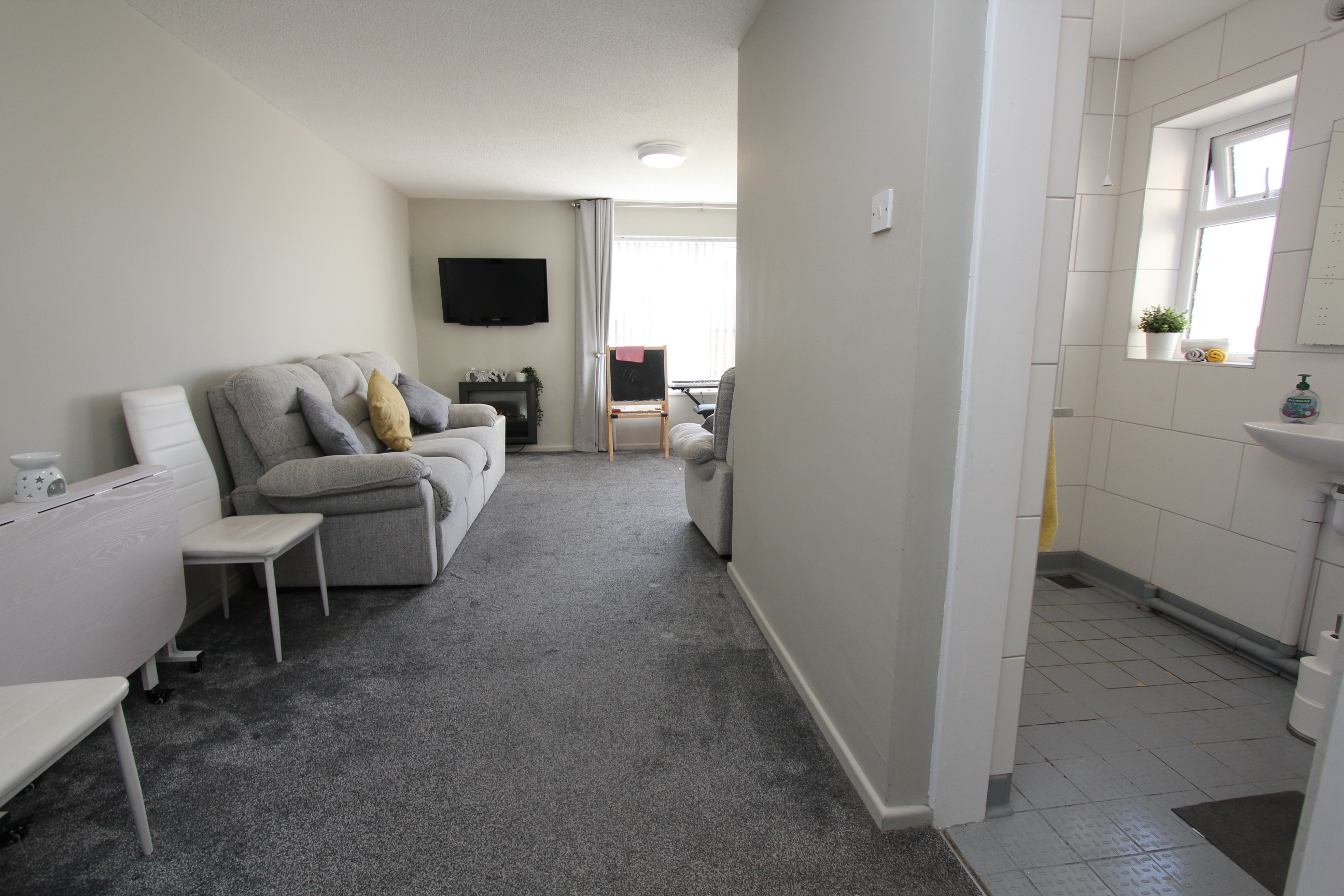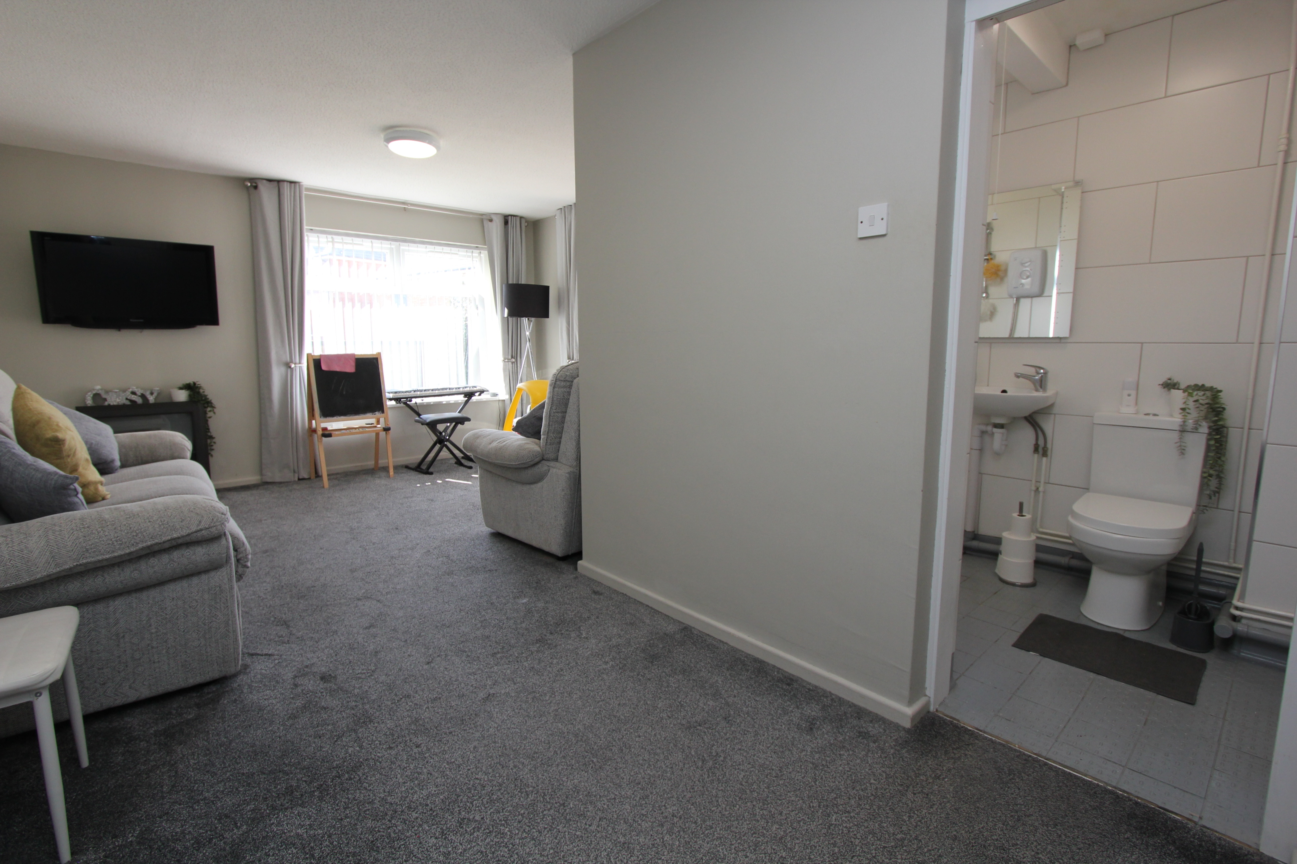 An L shape, this carpeted reception room has two radiators, rear uPVC doors and French doors giving access onto the rear garden. Handy full height storage cupboard. Sliding door leads to the wet room.