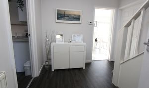 Modern vinyl floor and carpeted stairs to the first floor. Radiator and coving. Handy under stair storage cupboard. Panelled doors give access to the living room, kitchen/dining room and utility (this was previously used as a kitchen serving the annexe.