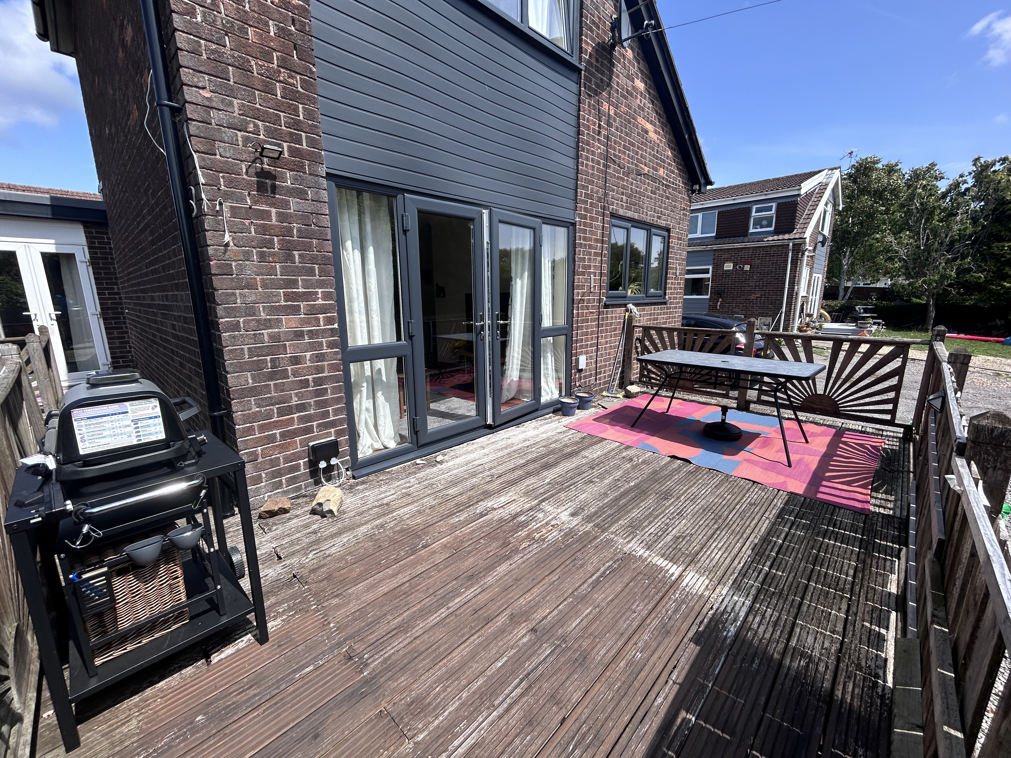 At the front there is a gravelled area with a further raised deck area, which sweeps to the side and accesses bedroom two via double glazed French doors. There are further steps down to a grassed area which is currently having wooden fencing installed. Water tap. The area to the rear is primarily laid to concrete enjoying complete privacy and offers the potential for a summer house/ decked area.