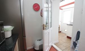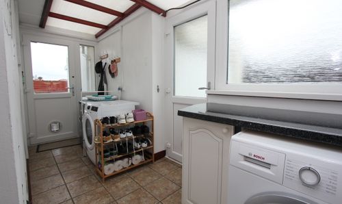 Ceramic tile flooring, there is space for additional appliances, boot and shoe storage etc. Obscure uPVC door which leads to the drive - with matching side window, plus an additional uPVC rear door leads to the rear garden. Polycarbonate style roof.