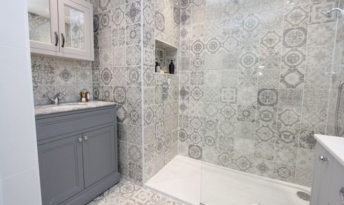 Beautifully refitted with stylish modern tiled walls, flooring and splash backs. White suite comprising WC with concealed cistern, wash basin with marble surround plus walk in shower enclosure with fixed glass screen. Here there is a rainfall style shower unit and adjustable rinse unit. Handy recessed storage / display shelf. Cosmetics cupboard and antique style radiator. Obscure side window. Smooth ceiling with 6 recessed spot lights and extractor. Handy storage cupboards and drawers with marble top over. In Wall electric toothbrush charger with shaver socket.