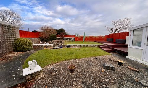 Fully enclosed rear garden which does have a return gated access to the front. Initially there is a stone chipped section and this leads to two areas of level lawn, decked area and feature rockery with established plants. Enclosed by well maintained fencing. Enjoys farmland views to the rear.