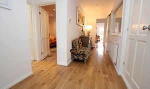 With solid Oak flooring. Matching panelled doors give access to the four bedrooms (currently used as two bedrooms, office and sitting room), luxury shower room and finally a sliding cottage style door leads to the modern kitchen. The kitchen is also viewable from a window from the hall - to allow passage of light. Radiator, smooth ceiling with 7 recessed spot lights. Plus there is a loft hatch and final double doors accessing handy storage.