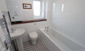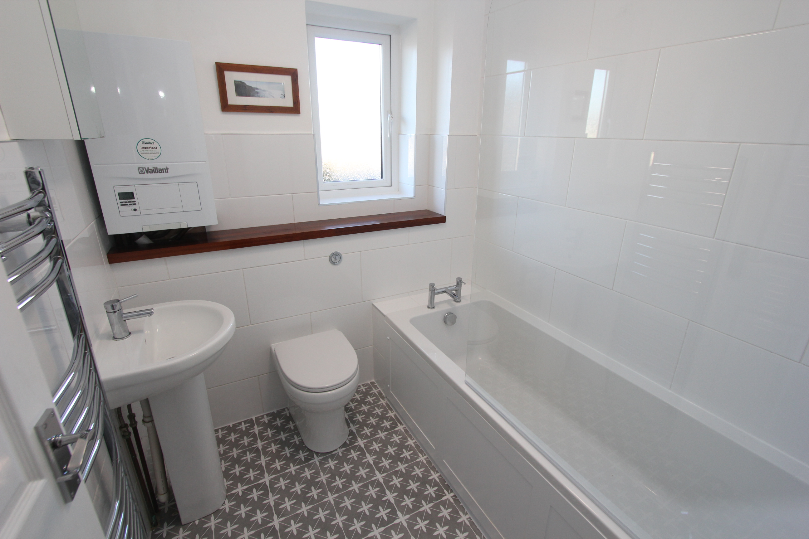 UPVC opaque window to rear. Low level WC. Paneled bath with mixer shower over. Ceramic wall tiles and floor tiles. Vertical radiator. Pedestal wash hand basin with mixer tap. Wall mounted combination boiler providing the central heating and hot water.