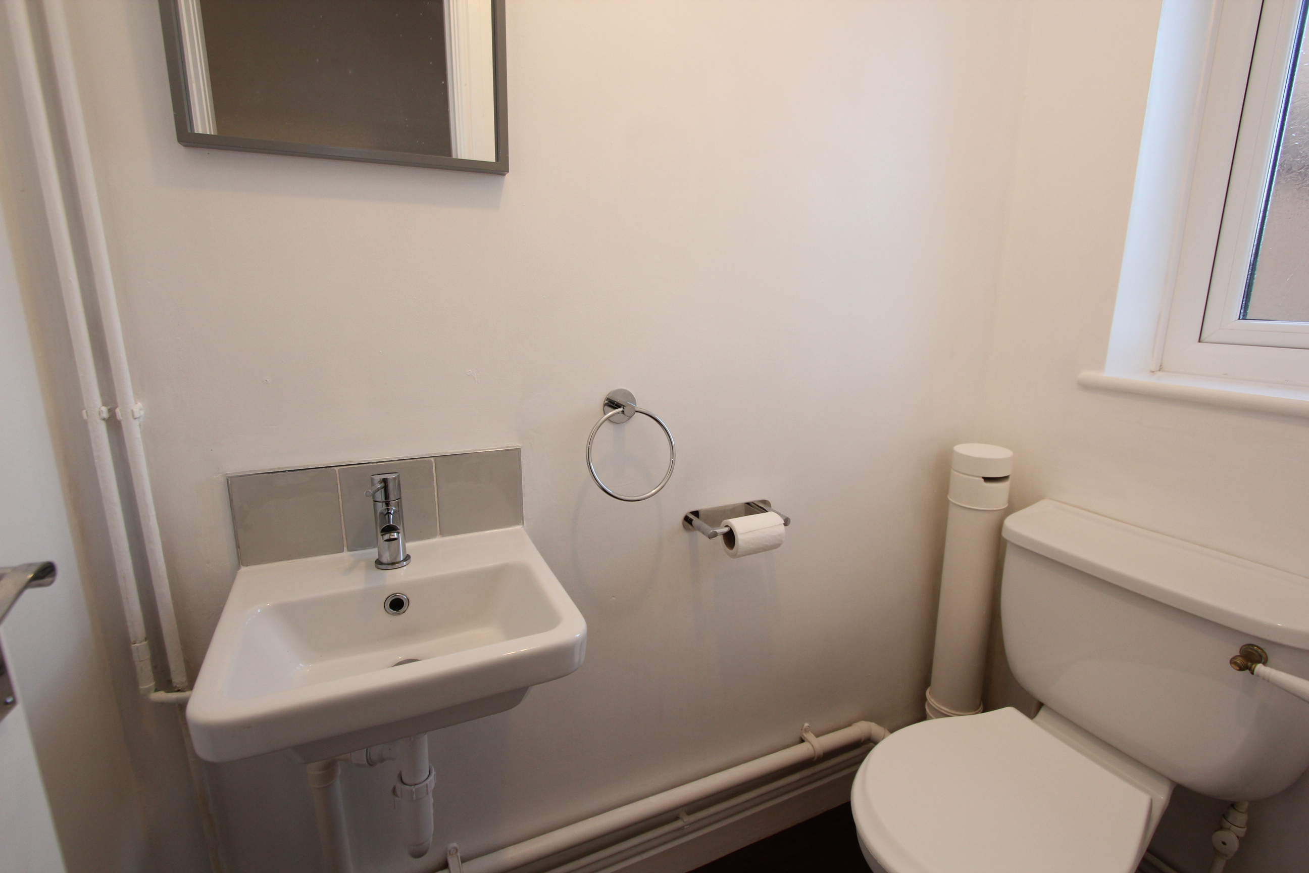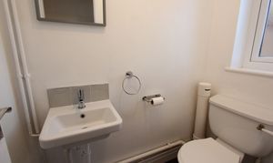 UPVC opaque window to front. Low level WC. Ceramic wash hand basin with mixer tap.