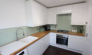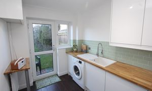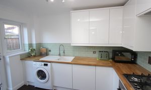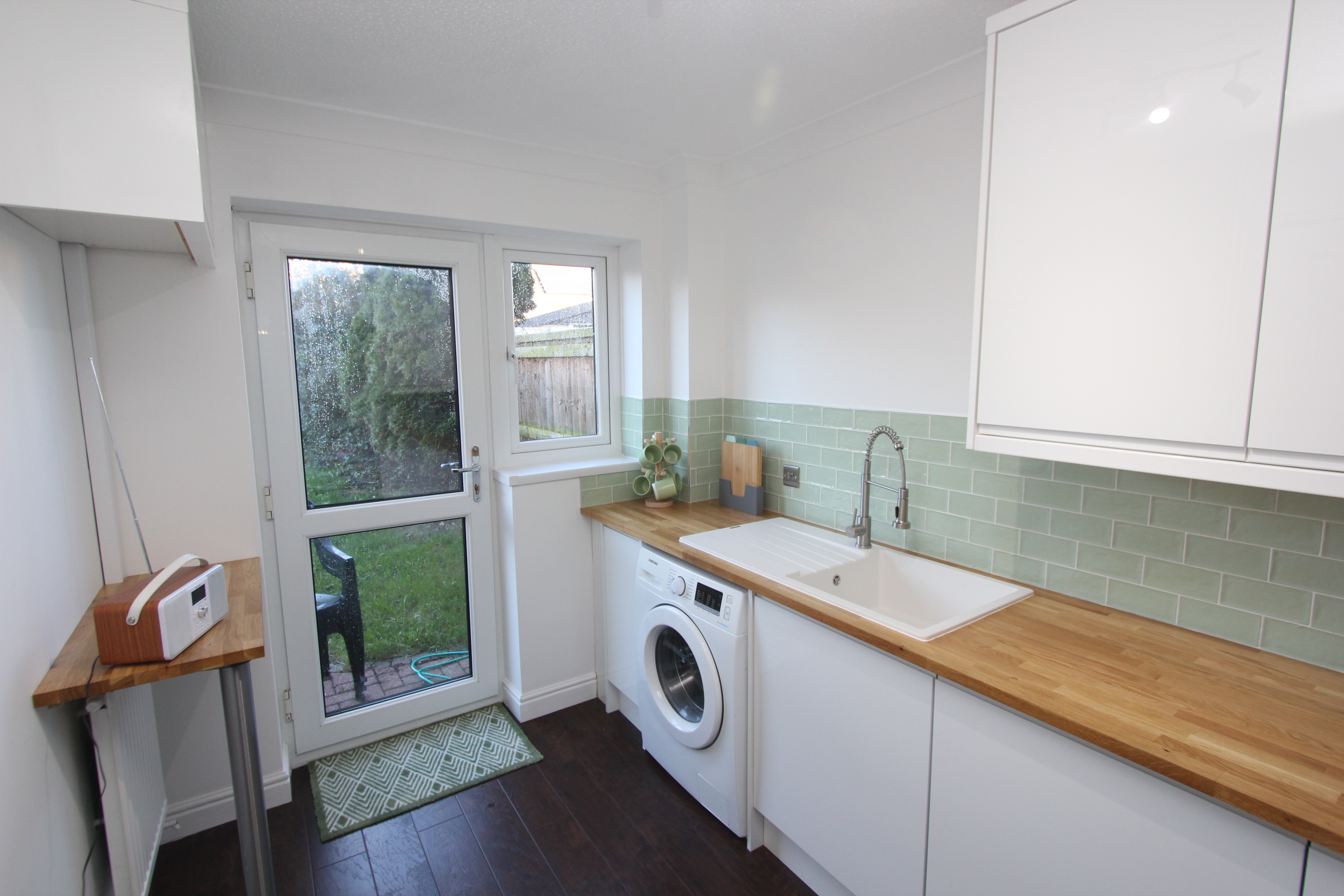 Fully fitted 2025 kitchen comprising eye level units base units with drawers and solid oak work surfaces over. Sink with mixer tap. gas hop, electric oven and extractor fan. Space for washing machine (available by separate negotiation). Integrated dish washer. Radiator. Breakfast bar area. partially tiled walls. Karndean flooring. UPVC glazed door to rear and UPVC window to rear.