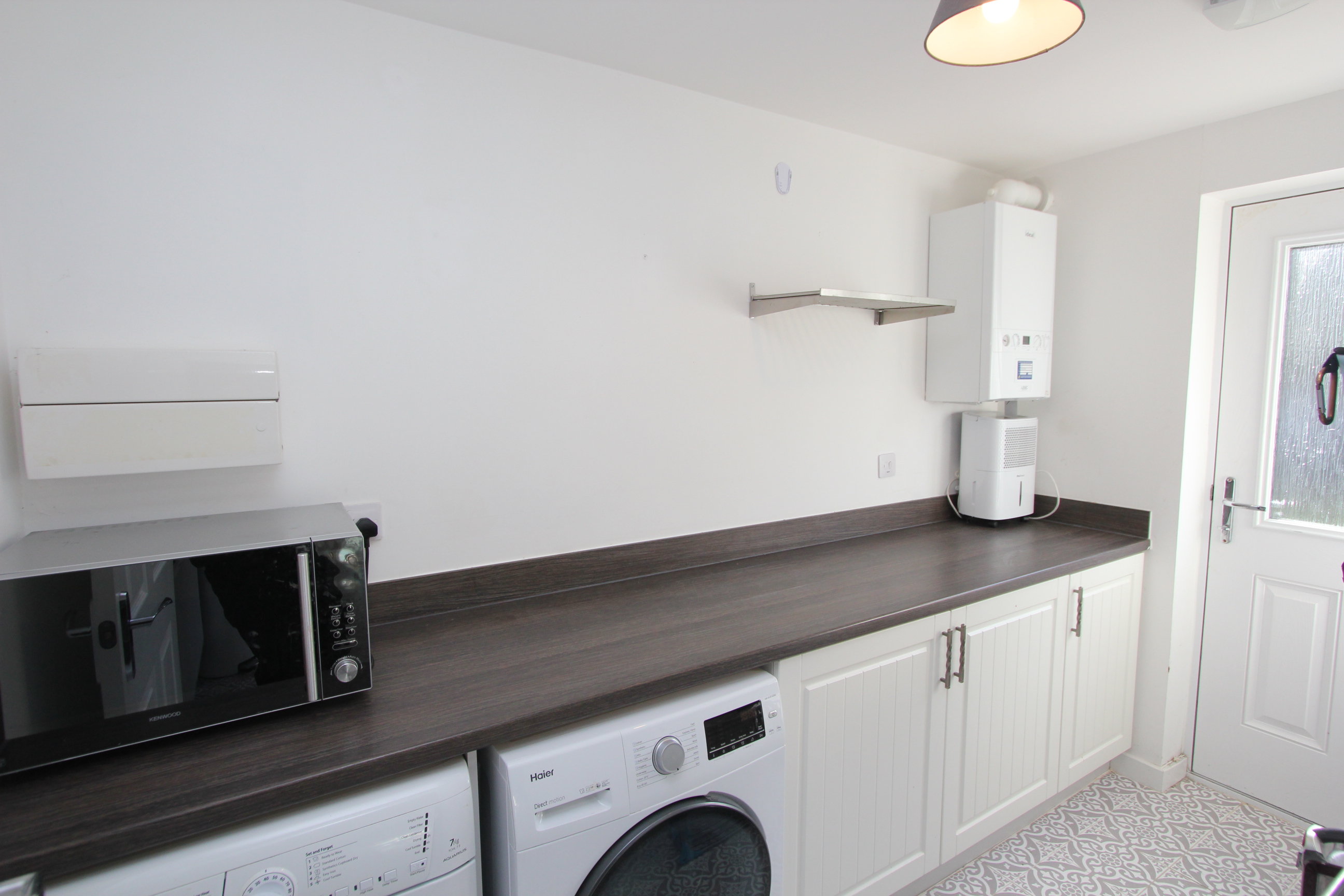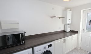 Opaque glazed door to rear. Ceramic floor tiles. 2Wall mounted Ideal gas boiler providing the central heating. Fully fitted base units with work surfaces over. Space for white goods. Radiator.