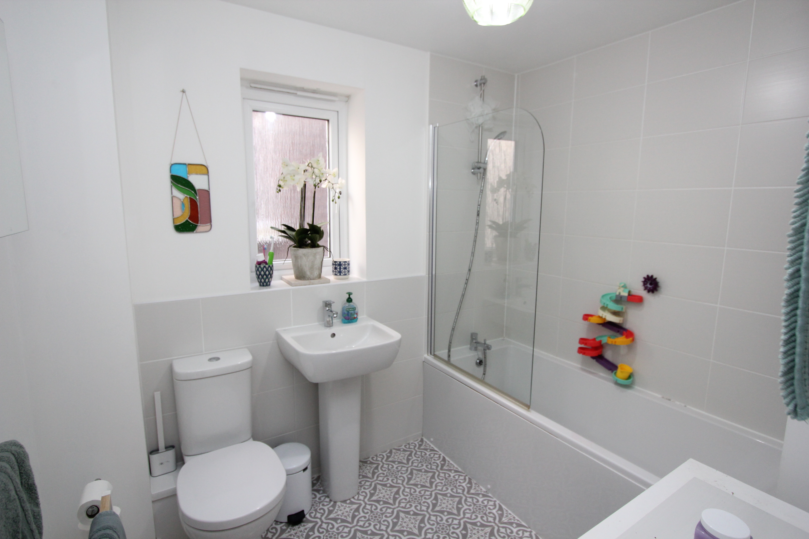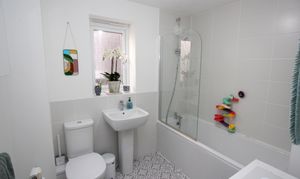 UPVC opaque window to side. Low level WC. Pedestal wash hand basin. Panelled bath with mixer shower attachment. Radiator. Ceramic floor tiles. Partially tiled walls.