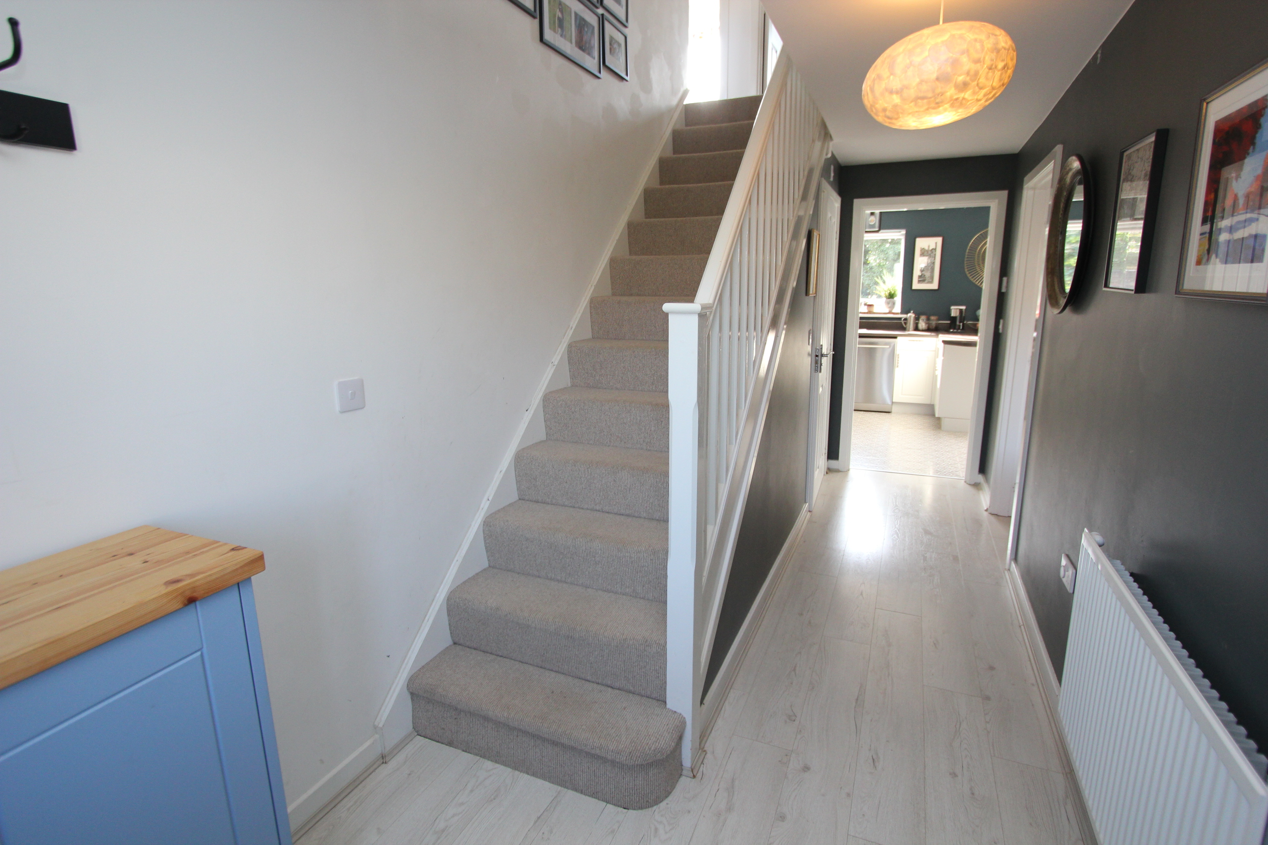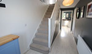 Radiator. Wood effect flooring. Opaque glazed front entrance door with tiled porch canopy. Stairs to first floor. Door to sitting room, kitchen/diner and cloakroom/WC.