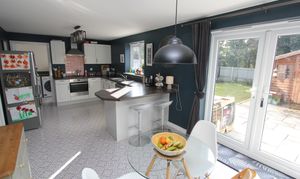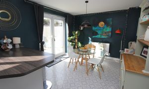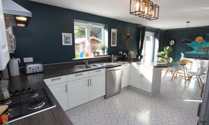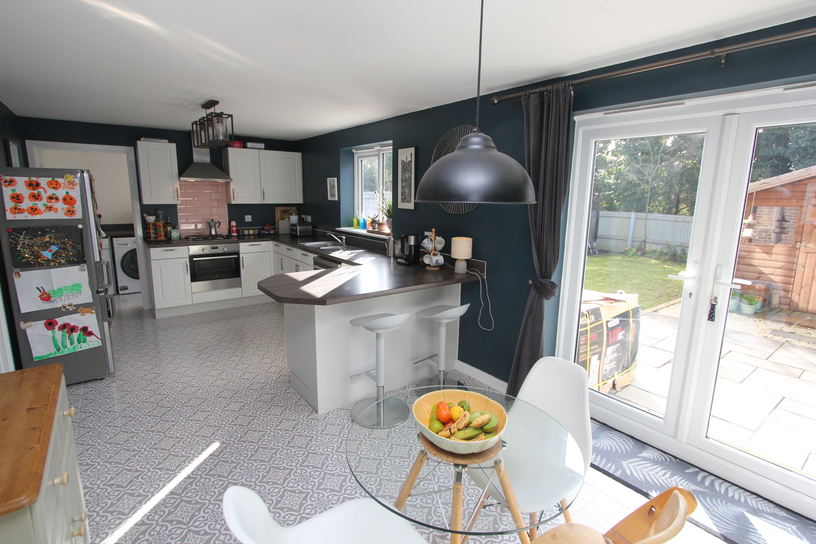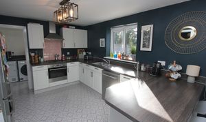 UPVC French doors to rear. UPVC window to rear. Fully fitted kitchen comprising eye level units base units with drawers and work surfaces over. Breakfast bar. Ceramic floor tiles. Space for dining room table and chairs. Space for white goods. Inset stainless steel sink with mixer tap. Integrated gas hob with oven and hood. Radiator. Door to utility room.