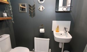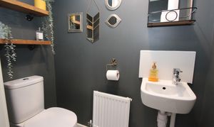 Radiator. Low level WC. Wash hand basin with mixer tap. Ceramic floor tiles.