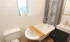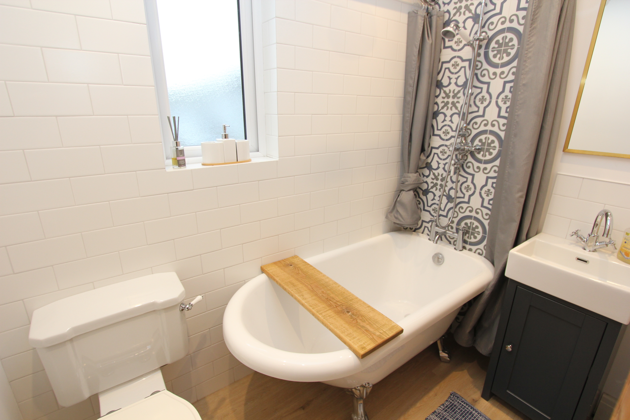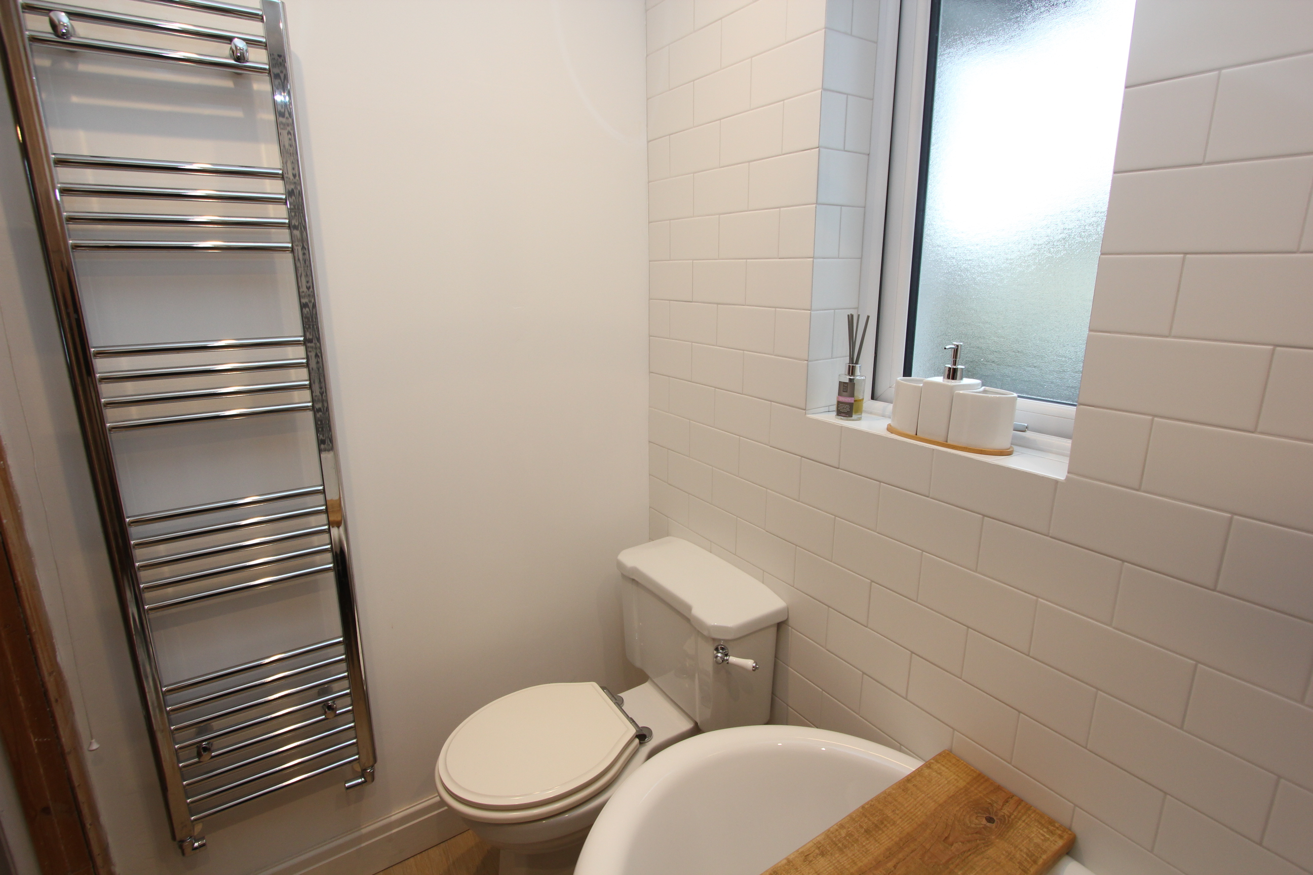 uPVC opaque window to front. Low level W/C. Ceramic wash hand basin. Roll top bath with mixer shower over. Down lighting. Vertical radiator. Over stairs linen cupboard. Partially tiled walls. Wood effect flooring.
