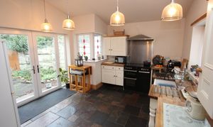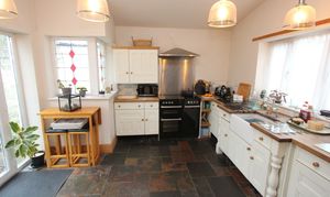 uPVC French doors to rear. uPVC windows to front and rear. Stone floor tiles with under floor heating. Fully fitted kitchen comprising eye level and base units with solid oak wood work surfaces over. Electric cooker with hood. Belfast sink with mixer tap. Space for white goods. Plumbing for dishwasher is in place.